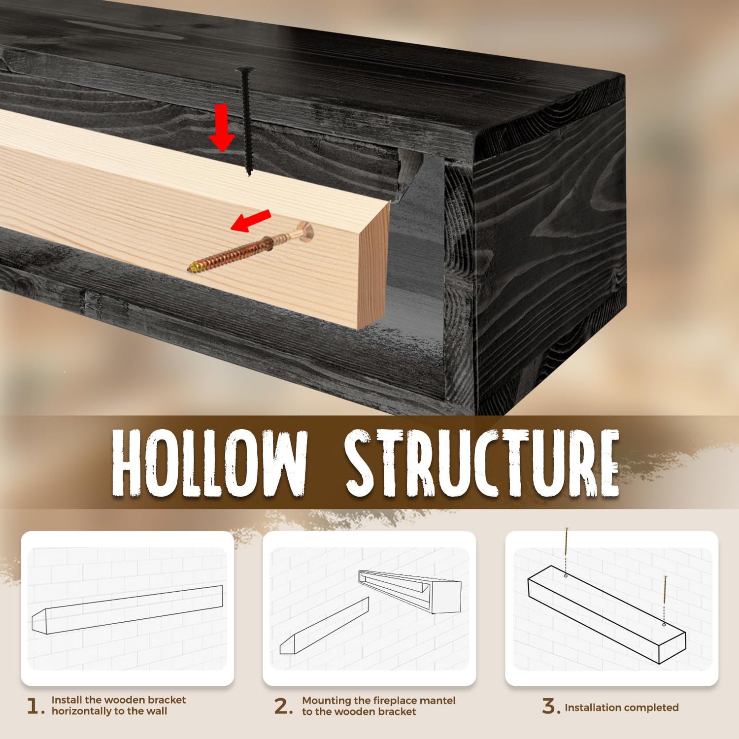 ABSWHLM 48x8x5 Fireplace Mantel - Handcrafted Hollow Rustic Solid Wood Wall Mounted Floating Shelf with Invisible Heavy Duty Wood Bracket (Weathered Black)