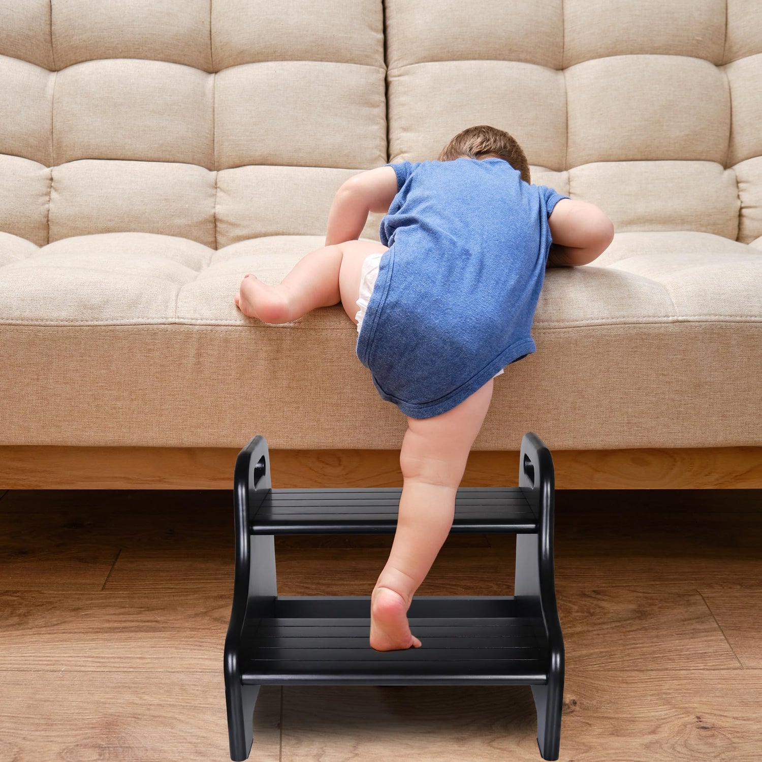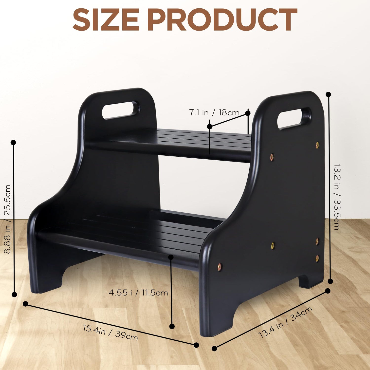 Acacia 2-Step Stool for Kid, Toddler Wood Step Ladder with 2 Handles, Safe Non-Slip Bottom, Rounded Corners, Supports up to 300 lbs, Perfect for Bathroom Bedroom (Black)