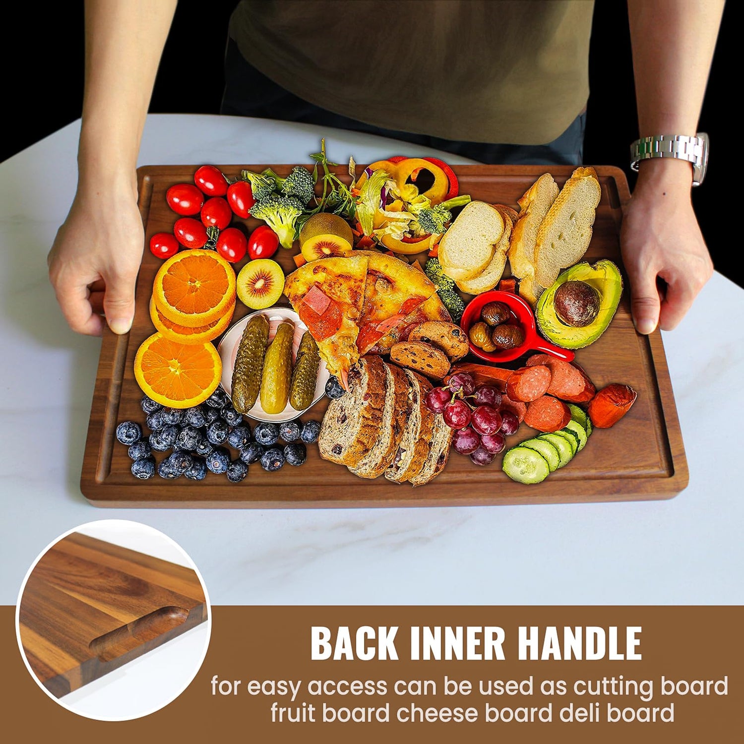 - Mess-Free Culinary Experience: Say goodbye to messy countertops! Our cutting board features a smartly designed juice groove that captures up to 30% more liquids from fruits, meats, and vegetables. It also has a comfortable inner handle design for easy carrying and moving, ensuring safety while cutting and serving food.