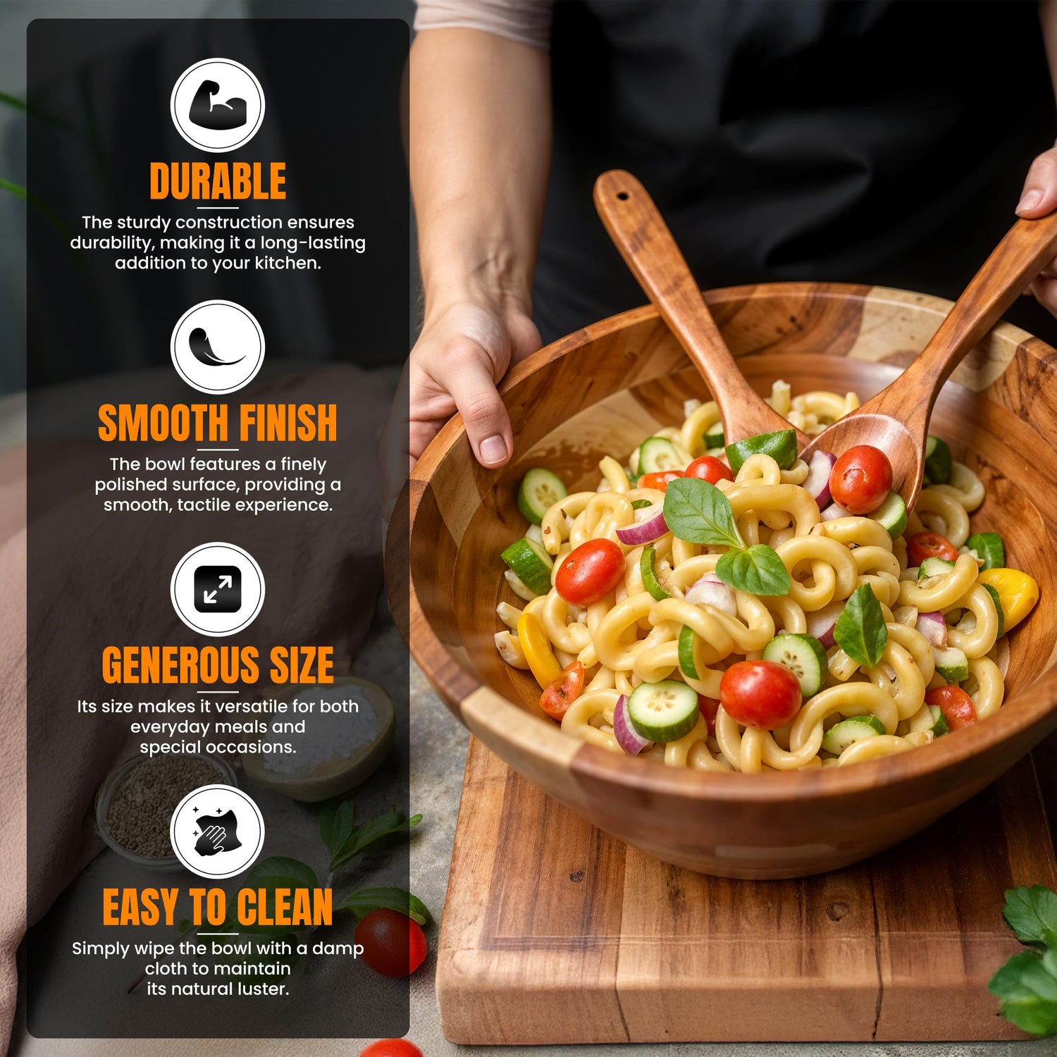 - DURABLE & FOOD-SAFE: Made from 100% natural acacia wood, this bowl is durable and food-safe, designed for everyday use. The wooden serving spoons complement the set, making it a functional yet stylish kitchen essential.