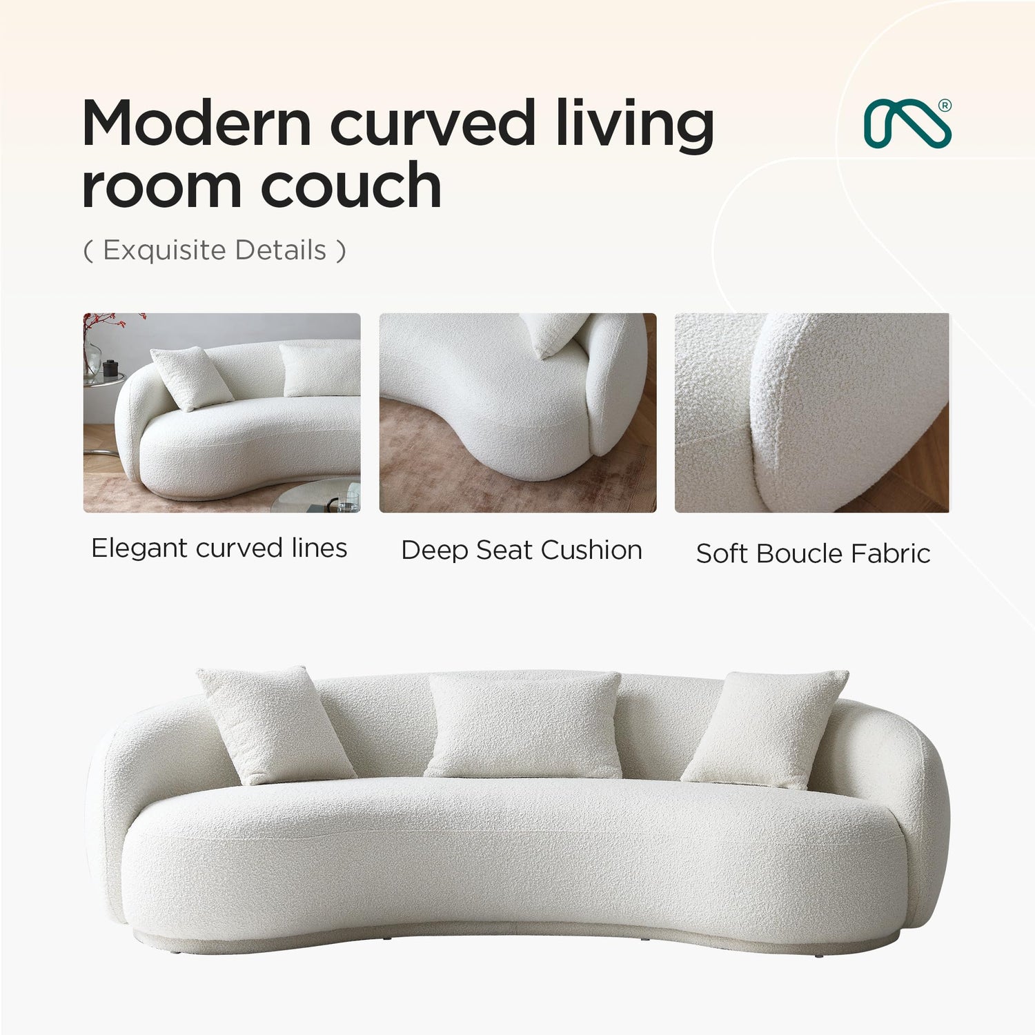 Details: The Acanva modern curved sofa couch oozes a sophisticated chic vibe to your living room, department, or office. With its rounded cute curves, low profile seating, accented by a comfy boucle fabric cover, the Acanva 3-seater sofa couch is sure a center attraction to impress. Wrapped in soft boucle fabric, the comfy sofa couch provides luxurious softness and skin-in comfort. The chic curve design makes this modern sofa full of modernity and leisure.PLEASE NOTE:1.Due to the difference between computer display and photography, the color of the pictures and actual products will be slightly different.2. The fabric type, color and patterns of throw pillows and back cushions possibly vary due to different production batches. We will keep trying to reduce the chromatism and improve product consistency between batches. Thank you for your understanding.