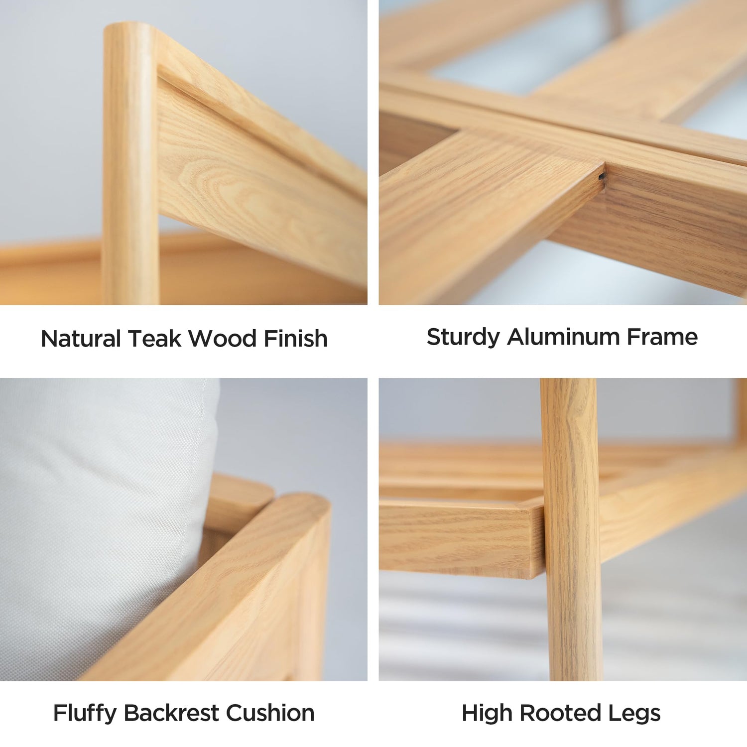 - Premium Construction: The sturdy aluminum frame with teak wood-toned finish and stainless steel hardware ensures the L-shaped patio couch will maintain its structural integrity season after season.