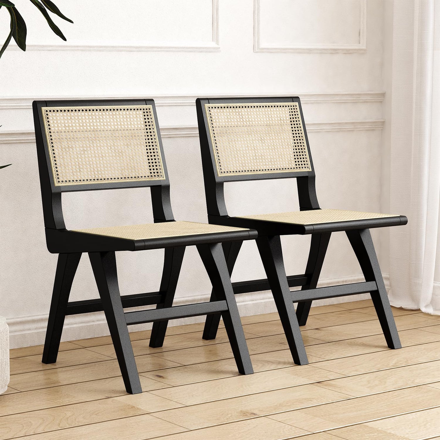 Accent Chair Dining Chairs Set of 2, Solid Wood Frame Boho Rattan Chair, Mid Century Modern Accent Chairs for Living Room Bedroom Dining Room Kitchen(Black)