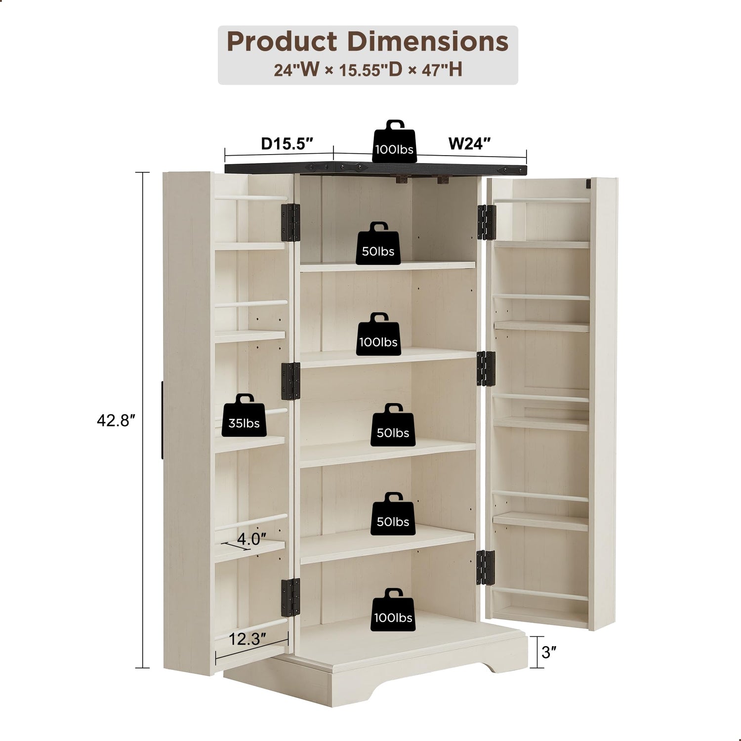 - Discover Versatile Storage Solutions: Unleash the potential of your space with our storage cabinent, generously sized at 24"W × 15.55"D × 47"H. Tailor your storage needs with 5 shelves (2 adjustable) and 10 door shelves (4 adjustable). Beyond organizing your kitchen essentials, this cabinet effortlessly transitions to accommodate bathroom necessities and enhance living room aesthetics. Elevate every corner of your home with impeccable organization.
