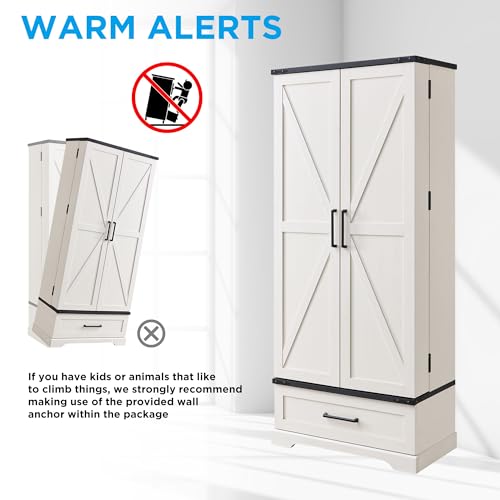 - BUILT FOR LAST. Crafted from quality MDF and reinforced with three hinges for each top cabinet door, our pantry cabinet ensures stability and durability for long-term use. For added safety, the included anti-tip kit secures the cabinet to the wall, providing a secure living space. Elevate your storage solutions with this stable, durable, and stylish pantry cabinet.