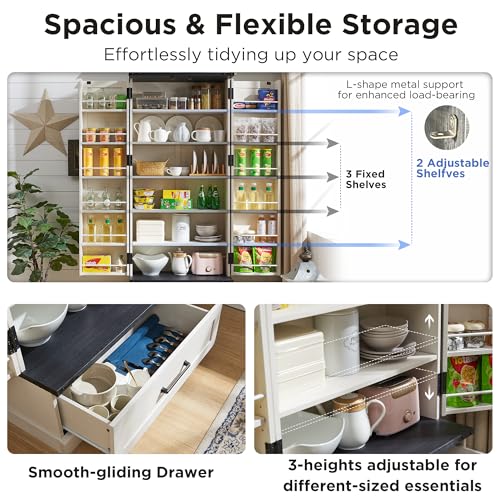 - ENJOY THE WELL-ORGANIZED STORAGE. The 12-door shelves, strategically designed with 3 different heights, maximize top cabinet space, ensuring easy access to small items like spices and olive oil. With a large cabinet, a spacious slide-out drawer, and 12 versatile door shelves, this pantry accommodates everything from food and dinnerware to kitchen appliances, effortlessly tidying up any space.
