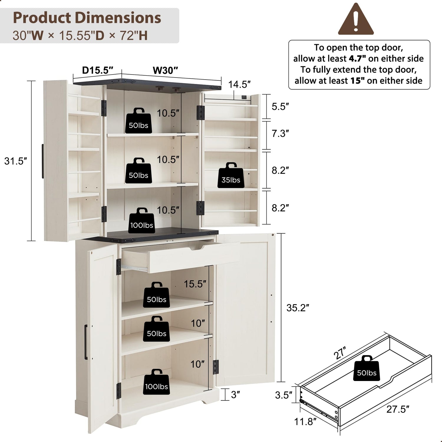 - Stable and Sturdy: Crafted from optimal P2 engineered wood and metal, ACCOHOHO storage cabinets feature a well-structured design that is steadfast and wobble-free, able to withstand the challenges of long-term use. The middle and bottom shelves have excellent weight capacity and can confidently support 100 lbs, while the remaining shelves and mid drawer can hold up to 50 lbs each. Each door shelf can hold 35 lbs. The included wall anchor kit prevents tipping for safety.