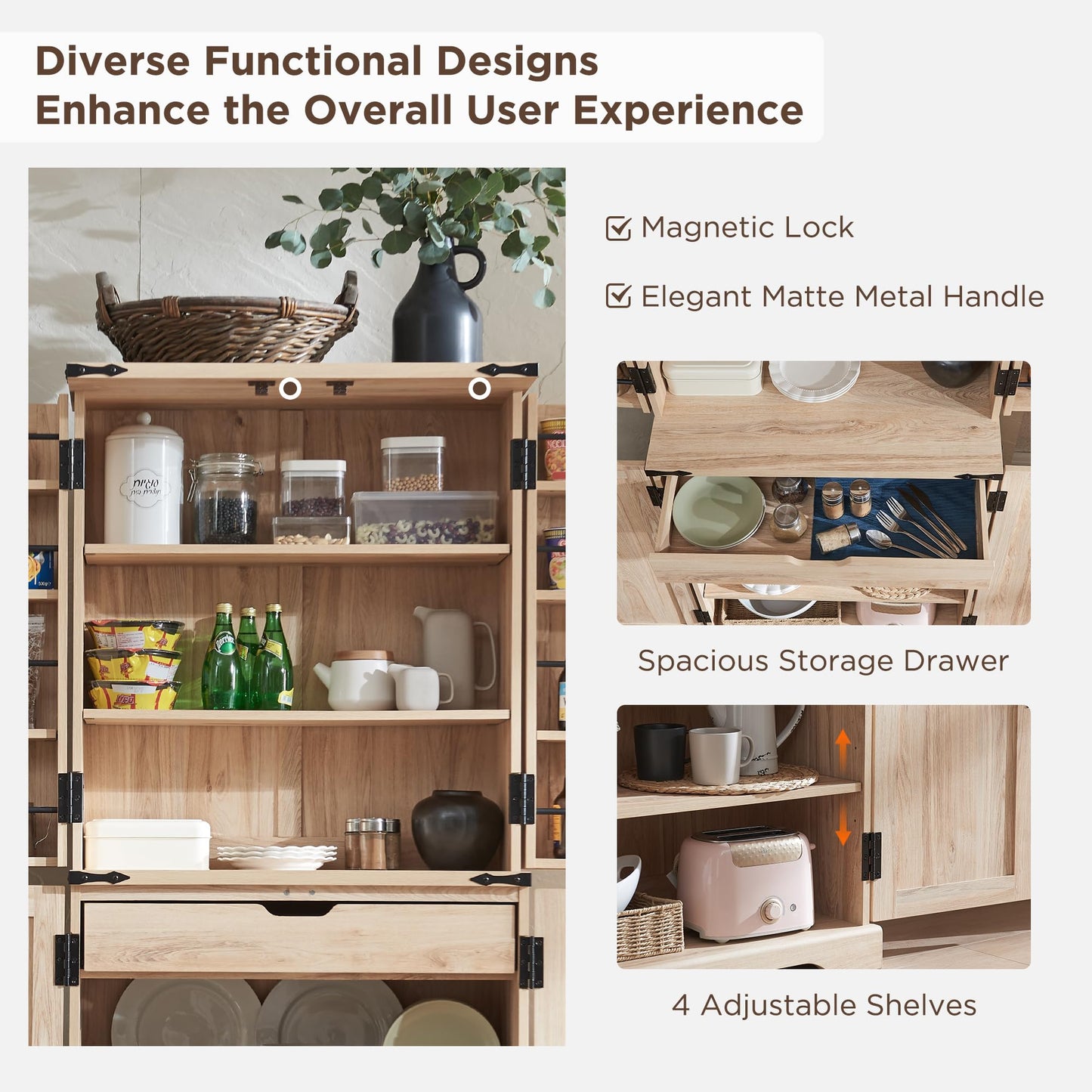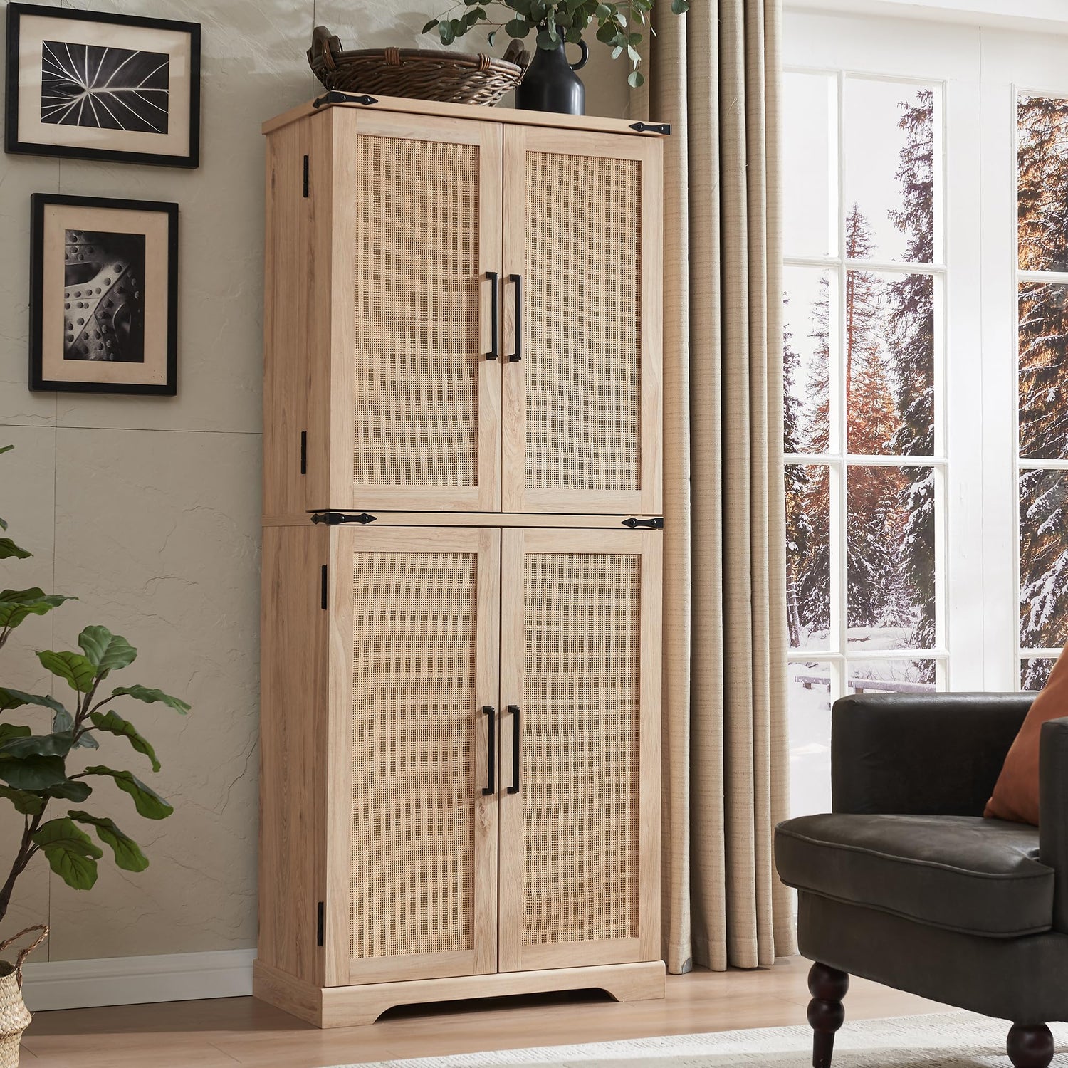 ACCOHOHO 72" Tall Kitchen Pantry with Rattan Doors, Storage Cabinet with Organizer, Drawer and Adjustable Shelves, Wood Cupboard for Kitchen, Dining Room, Bathroom and Hallway, Natural Oak