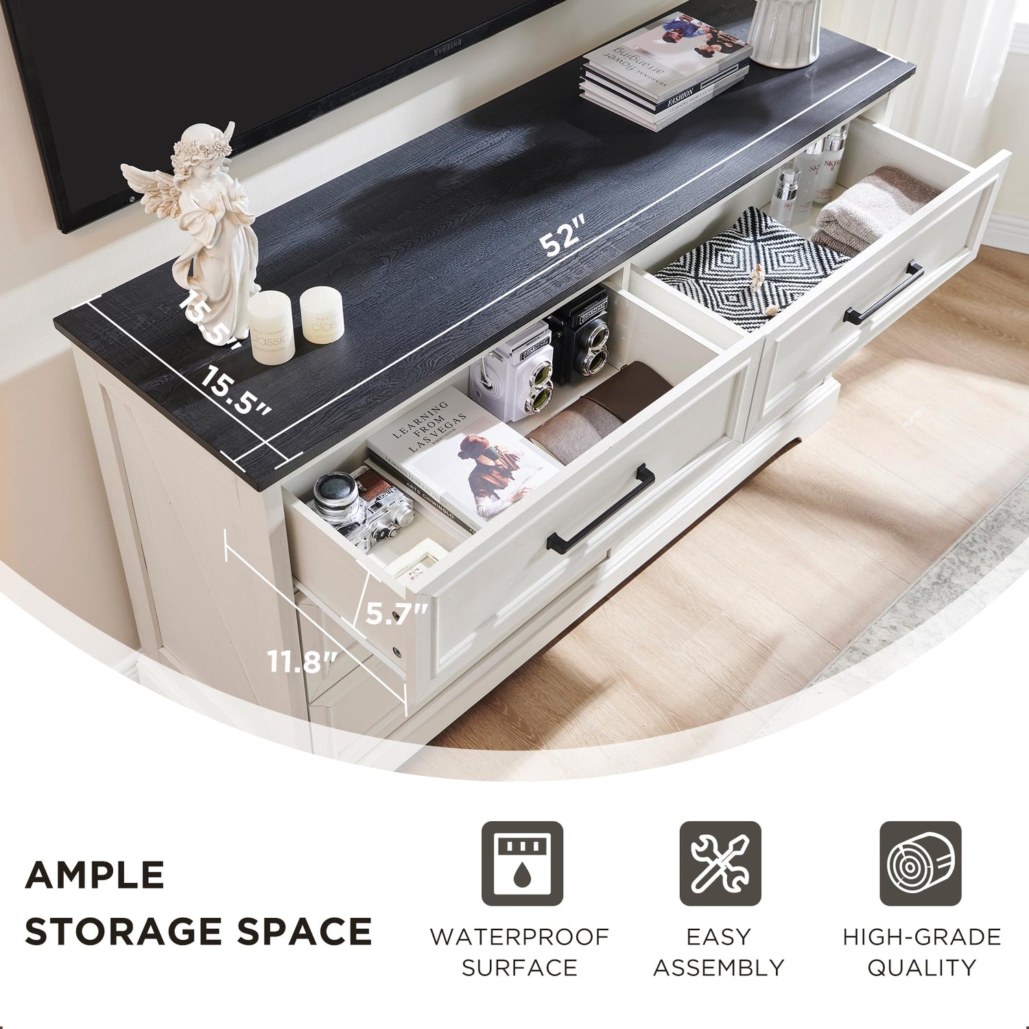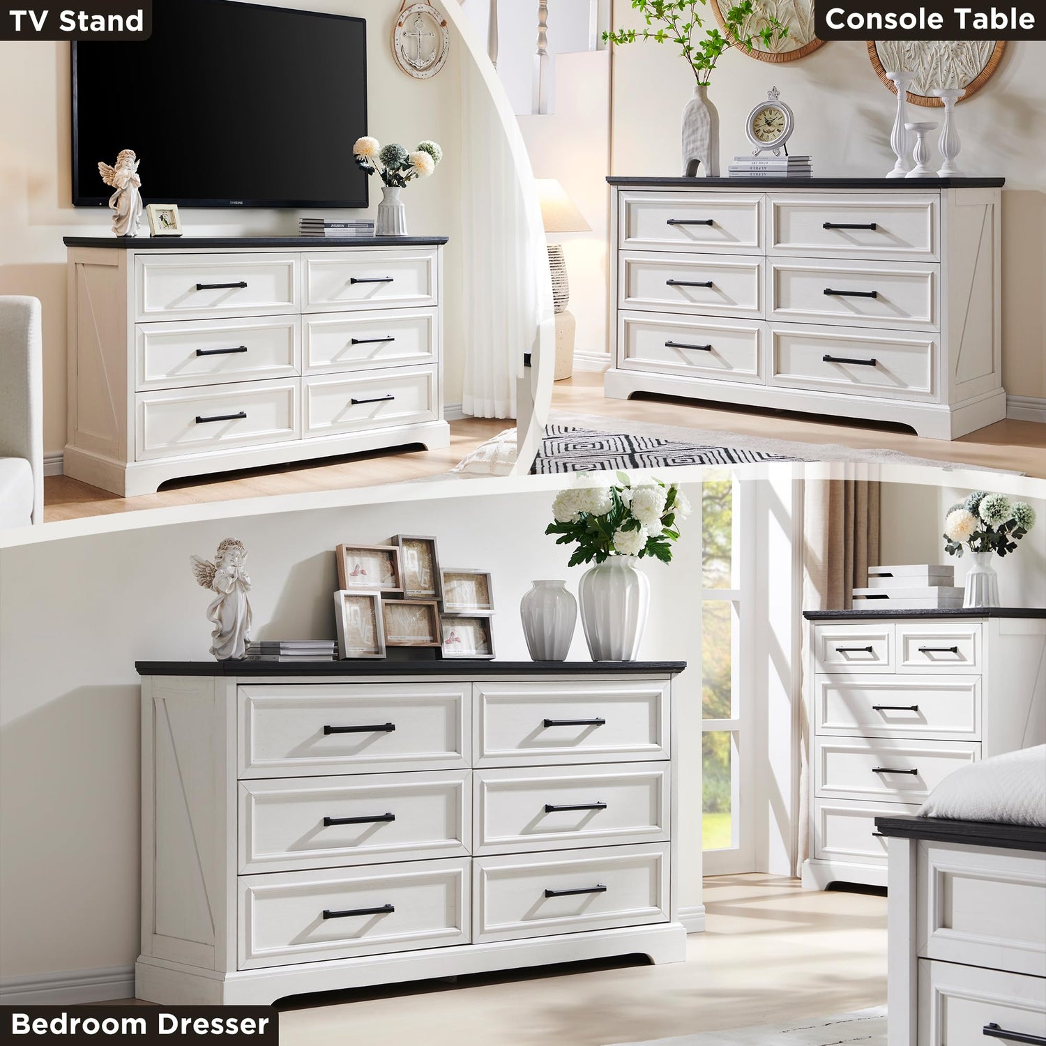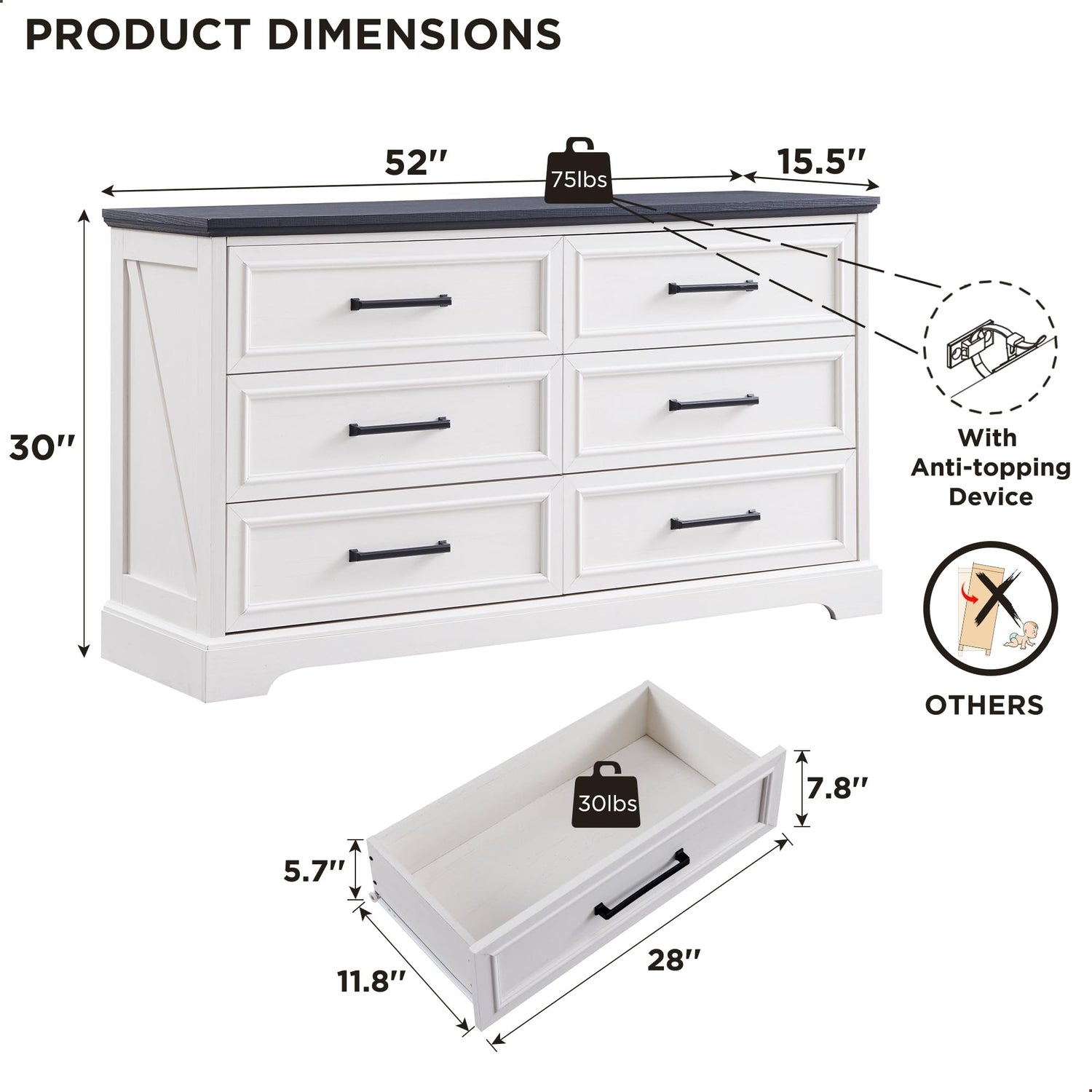 ACCOHOHO Farmhouse 6 Drawer Dresser for Bedroom, 52 Inch Wide Modern Dresser TV Stand with Large Drawers & Bar Handles, Rustic Wood Dresser Chest of Drawers for Bedroom, Living Room, Hallway, White