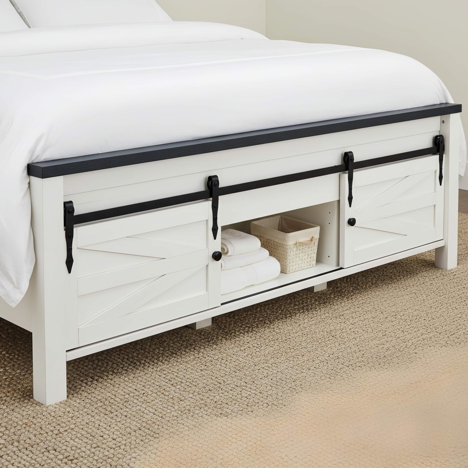 - Barn Door Storage Area, Max Storage Capacity: The barn door storage space at the footboard is sufficient to store clothes, bedding, and other items in categories. The layout of the Queen size makes the storage area more reasonable, easily solving the bedroom storage problem and keeping the space tidy and orderly.
