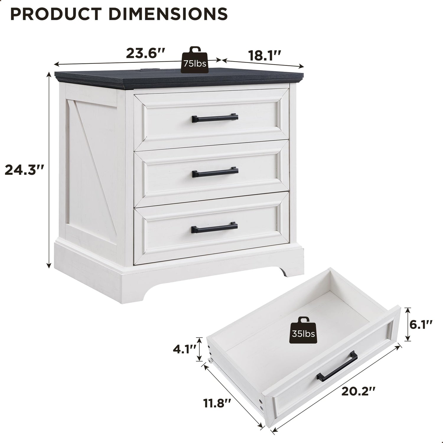 ACCOHOHO Farmhouse Nightstand with Charging Station, 24 Inch Wide End Table with 3 Large Drawers & Bar Handles, Rustic Wood Small Dresser Chest of Drawers for Bedroom, Living Room, Closet, Off White