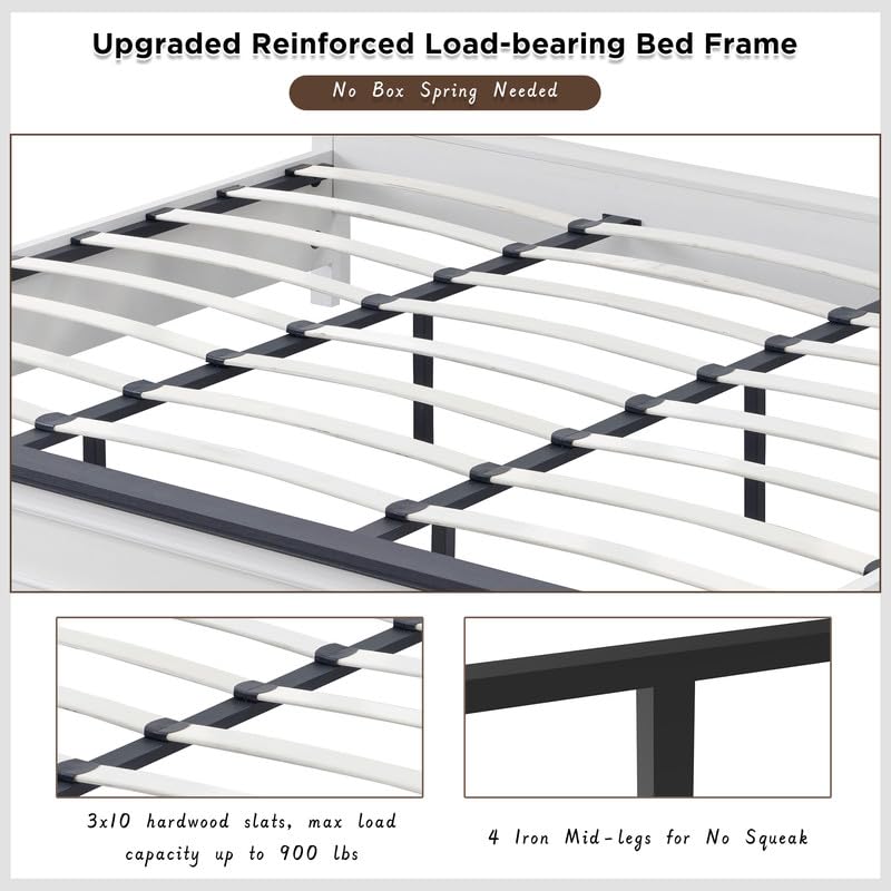 With a maximum load capacity of 900 lbs, this heavy-duty base is engineered for exceptional stability. The bed frame incorporates bolt-on rails and a centre-supported slat system, ensuring even weight distribution across 30 premium wood slats. The robust wrought steel frame and four inner bed legs provide reliable support for peaceful, noiseless nights, allowing you to enjoy restful sleep without the need for a box spring.