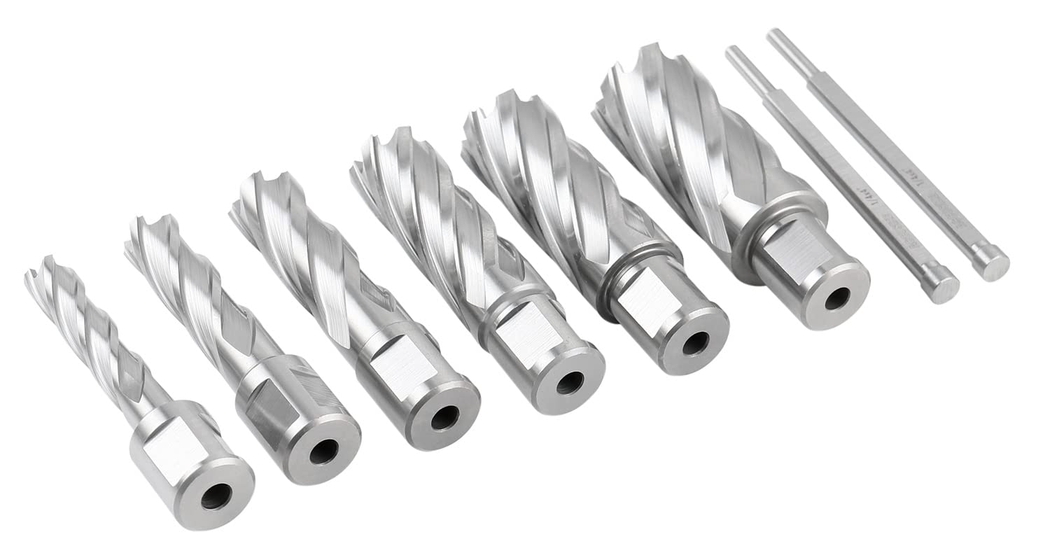 - 2 inch cutting depth, 3/4 inch weldon shank Annular cutter kit. Includes 6pcs Annular cutter and 2 pcs Pilot pins