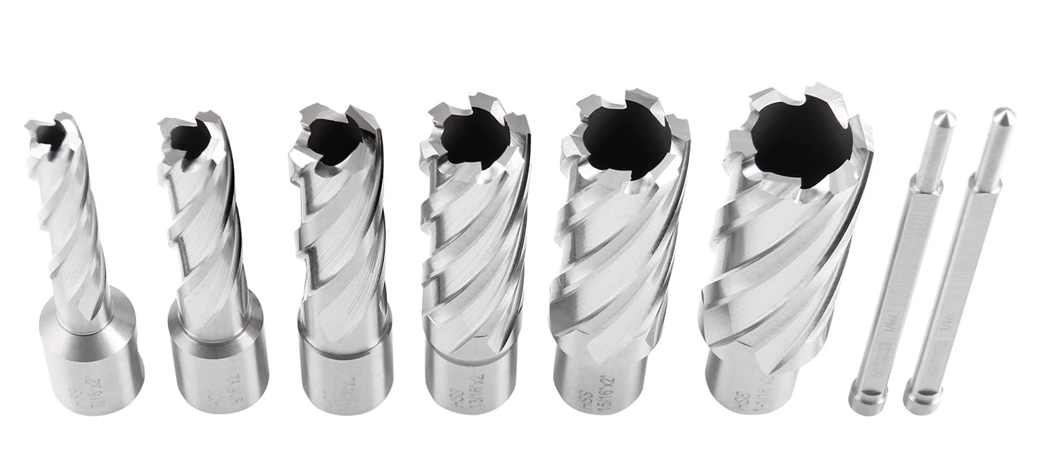 - Comprehensive Set: Comes with 8 pieces, including 6 annular cutters and 2 pilot pins, housed in a durable, heavy-duty box for organization and protection.