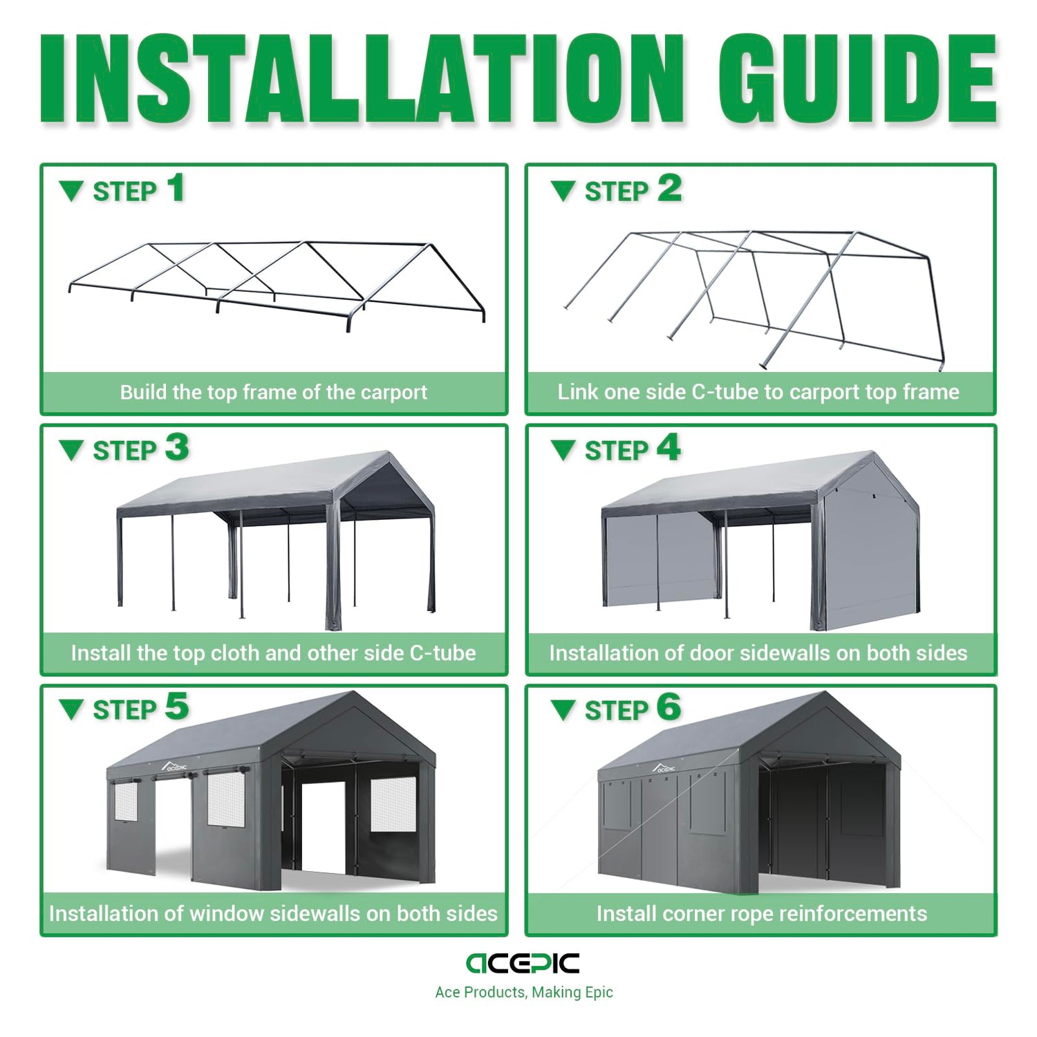 - Easy Installation: 10x20 carport canopy is designed for hassle-free setup with clear instructions and all necessary hardware included. It features a strong 3-hole extension chassis, windproof ropes, and ground spikes for added stability. Each component is clearly numbered, and the spring button poles allow for quick, tool-free assembly.