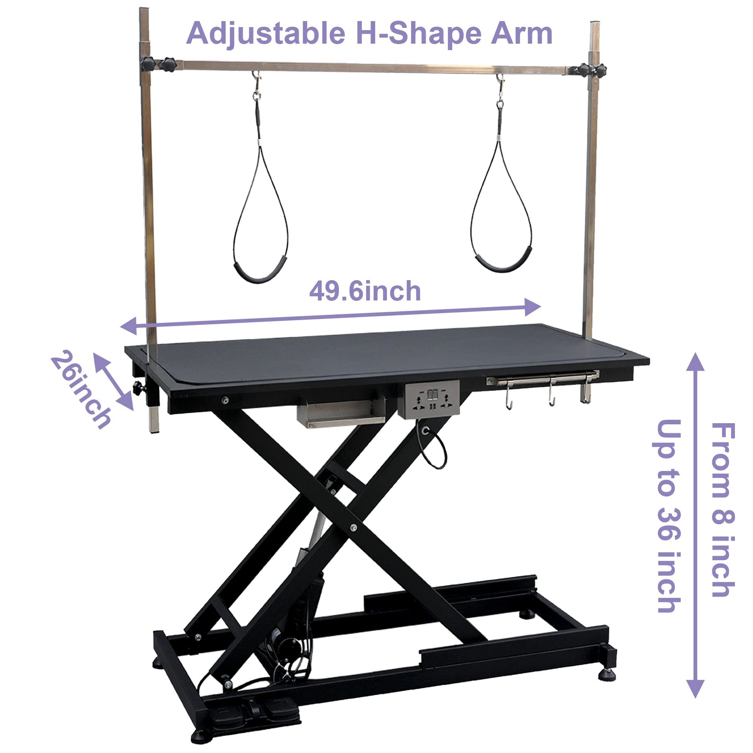- 【Effortless Height Adjustment】The grooming table features an electric motor-driven height adjustment mechanism, controlled by a foot pedal. This allows you to effortlessly adjust the table's height according to your preference, saving time and effort. With a load capacity of up to 264 lbs and a height range from 8'' to 36'', the electric lifting system ensures convenience and efficiency during grooming sessions.