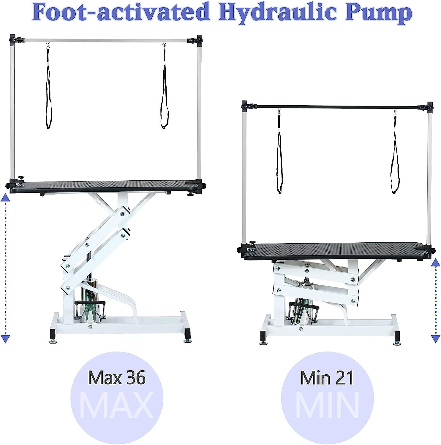 • 🐩Stable Hydraulic Pet Drying Table - 4 evenly spread supporting points with Z-Lift Base can make this table providing extra stability and eliminates wobbling and tipping. The hydraulic foot activated mechanism make you adjust height easier(21"-36"H), you can freely lower the height and save more space when you no need.