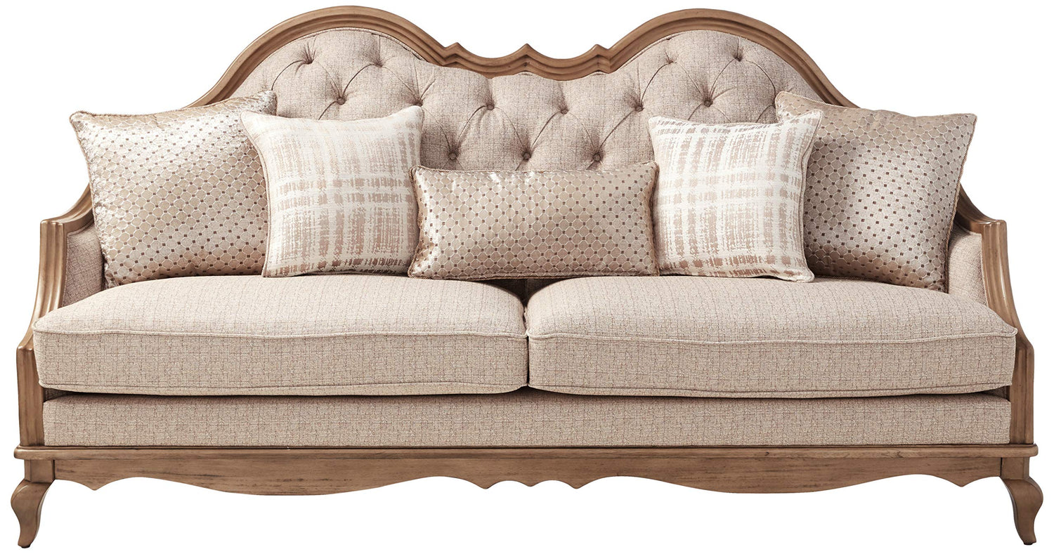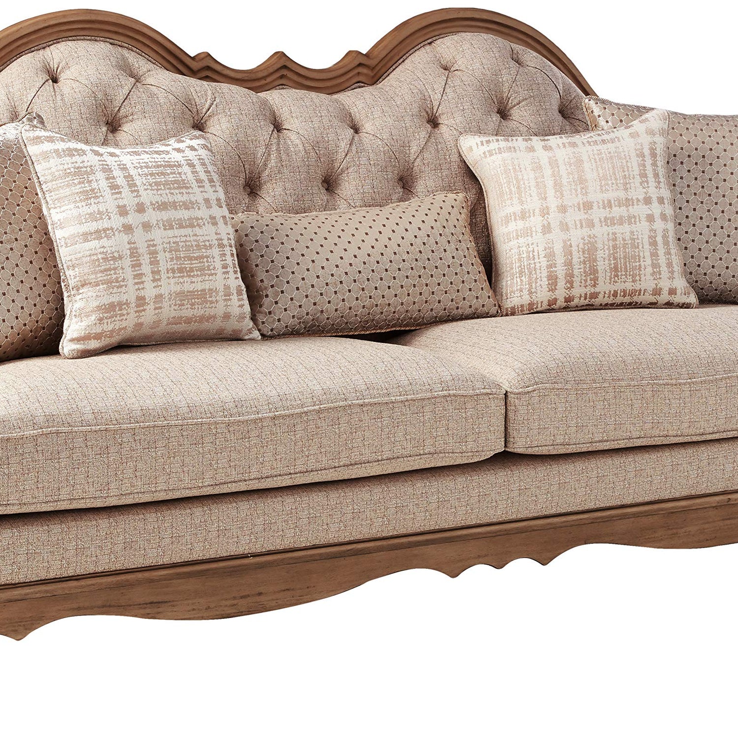 Details: ACME Furniture 56050 Chelmsford sofa with 5 pillows, Beige Fabric & Antique Taupe. 5 pillows included. Button Tufted: backrest Cushions. Tight Back & Seat cushions. The country of Origin of the product is China.