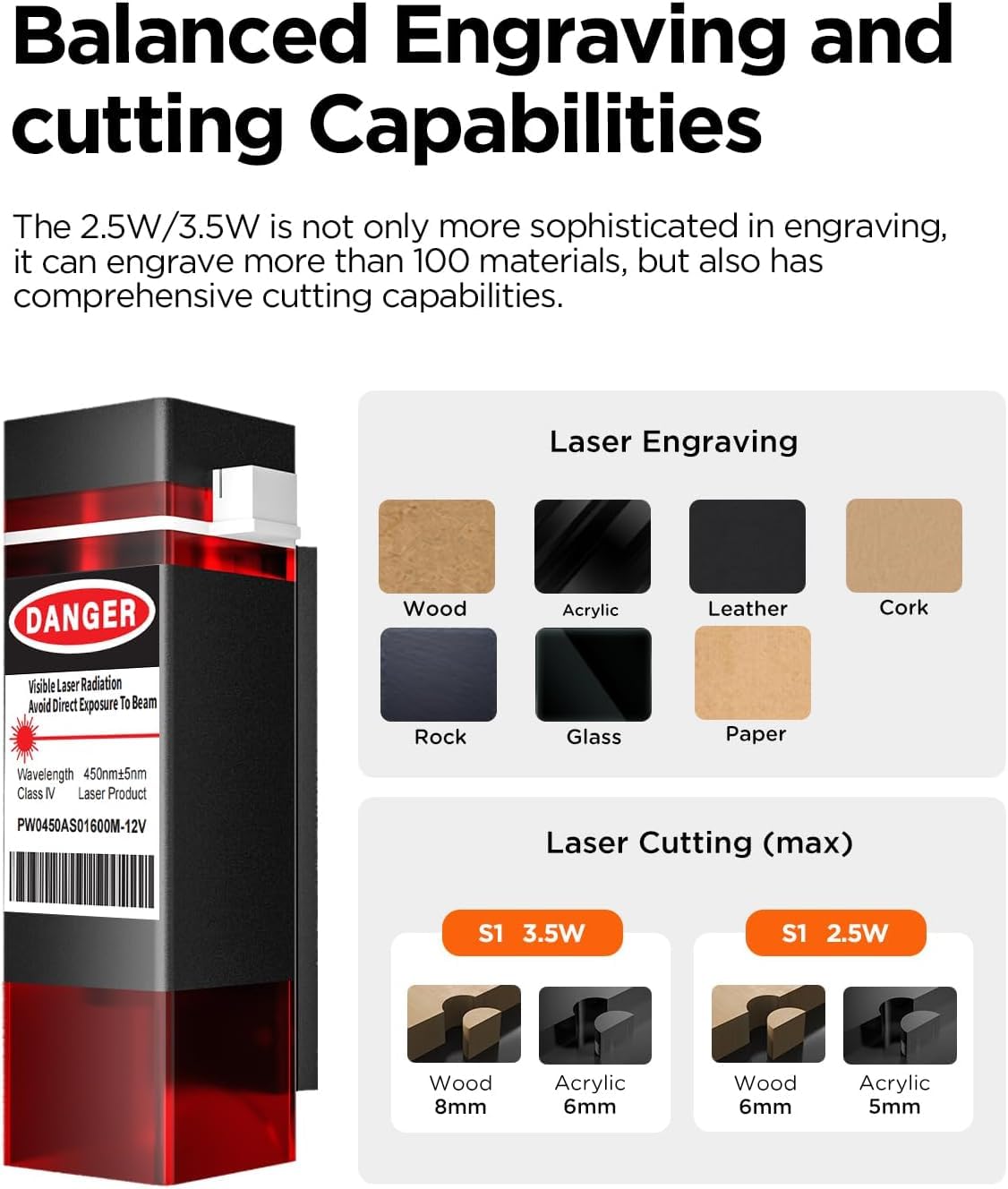 - 【Engraving and Cutting】With laser output in 2500mW/3500mW/6000mW, laser class 4. ACMER S1 laser engraver can engrave over 100 materials with an ultra-fine 0.04 x 0.04mm spot and speed up to 10000mm/min, achieve 1:1 photo realistic engravings. It can not only to engrave delicate and intricate designs, but also has certain cutting capabilities for many materials. We have recommended engraving parameters for common materials. If you want to achieve more engraving effects, you need to try more on your own.