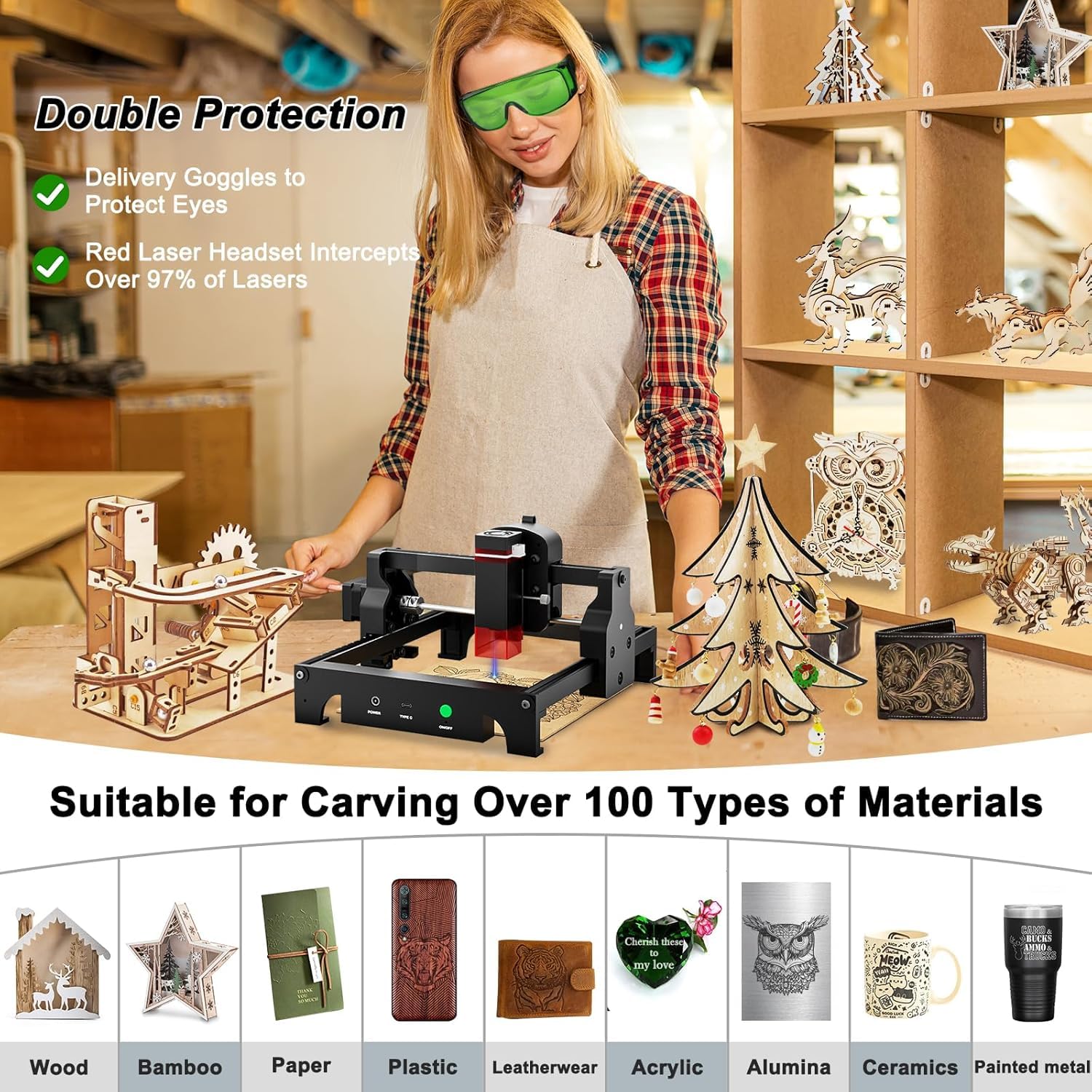 - 2-in-1 Engraving & Cutting Versatility: Designed as both a laser engraver and laser cutter, this machine supports engraving on wood, bamboo, leather, plastic, PCB, aluminum oxide, coated metals, ceramics, and more. It also cuts through thin plywood, MDF, and opaque acrylic, offering expanded possibilities for DIY projects, small businesses, and hobbyists.