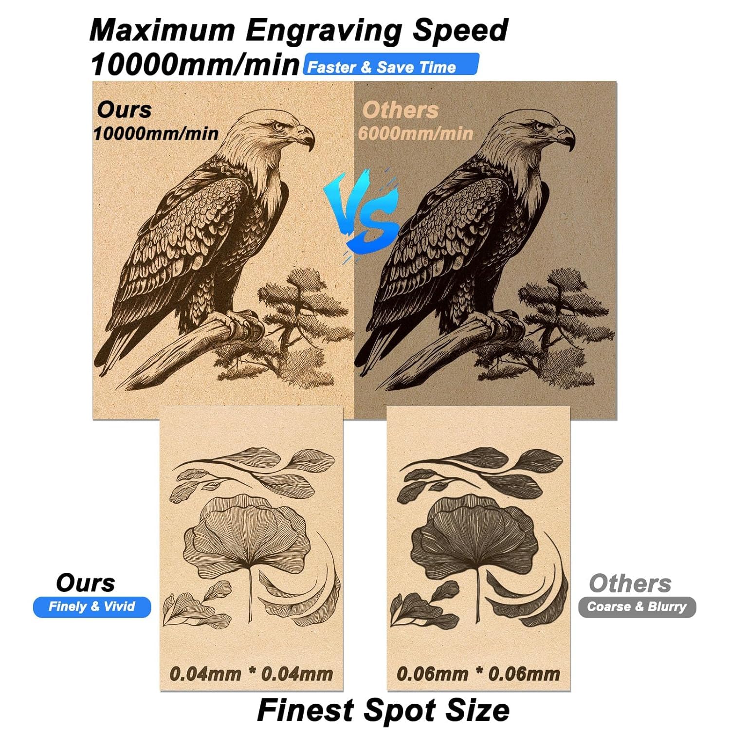 - High-Precision Laser Engraving and Cutting: The Acmer S1 laser engraver machine delivers exceptional performance with a powerful 3500mW laser output and an overall machine power of up to 36W. Featuring a diode laser with harmonic lens technology, a 455±5nm wavelength, and a 2mm focal length, it ensures ultra-fine engraving accuracy. The laser cutter and engraver machine achieves a maximum engraving speed of 10,000mm/min with a repeatable positioning accuracy of 0.01mm, bringing your creative projects to life with vivid precision.
