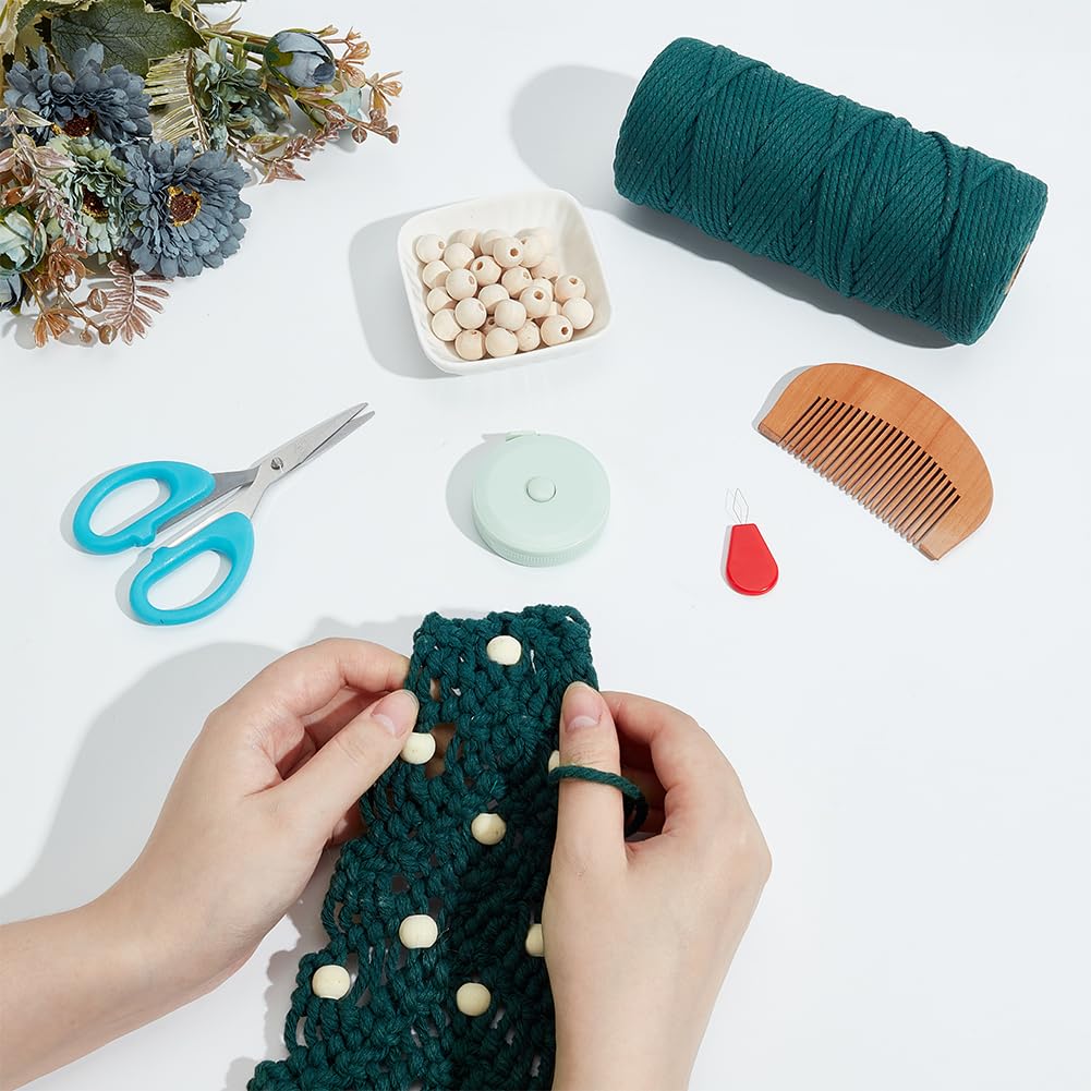 - [COMPLETE DIY MACRAME CHRISTMAS TREE KIT]: Our Christmas tree macrame kit includes a roll of blackish green cotton rope. 1 threading tools, 100 large hole wooden beads, scissors, tape measure and comb. Through these things, you can make your own large Christmas tree as a Christmas wall hanging decoration.