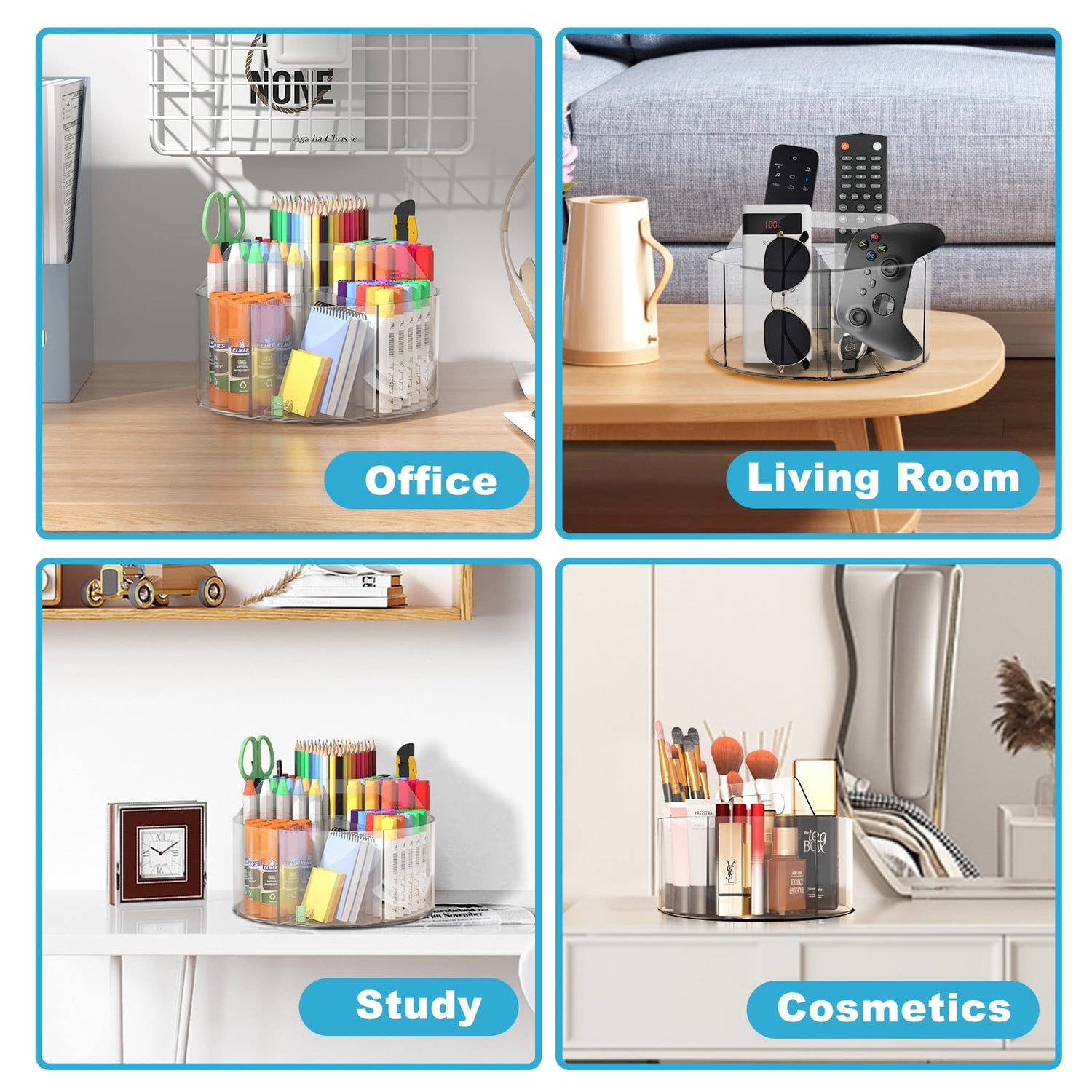 - Spinning Acrylic Caddy Organizer with Handle Design: The 360-degree acrylic desk storage organizer's rotatable design allows each compartment to face you easily and access what you need; Unique carrying handle at the top allows you to move or carry the clear office organizer with one hand. The clear rotating desk organizer is suitable for use in the office living room bedroom study classroom bathroom wherever you need it
