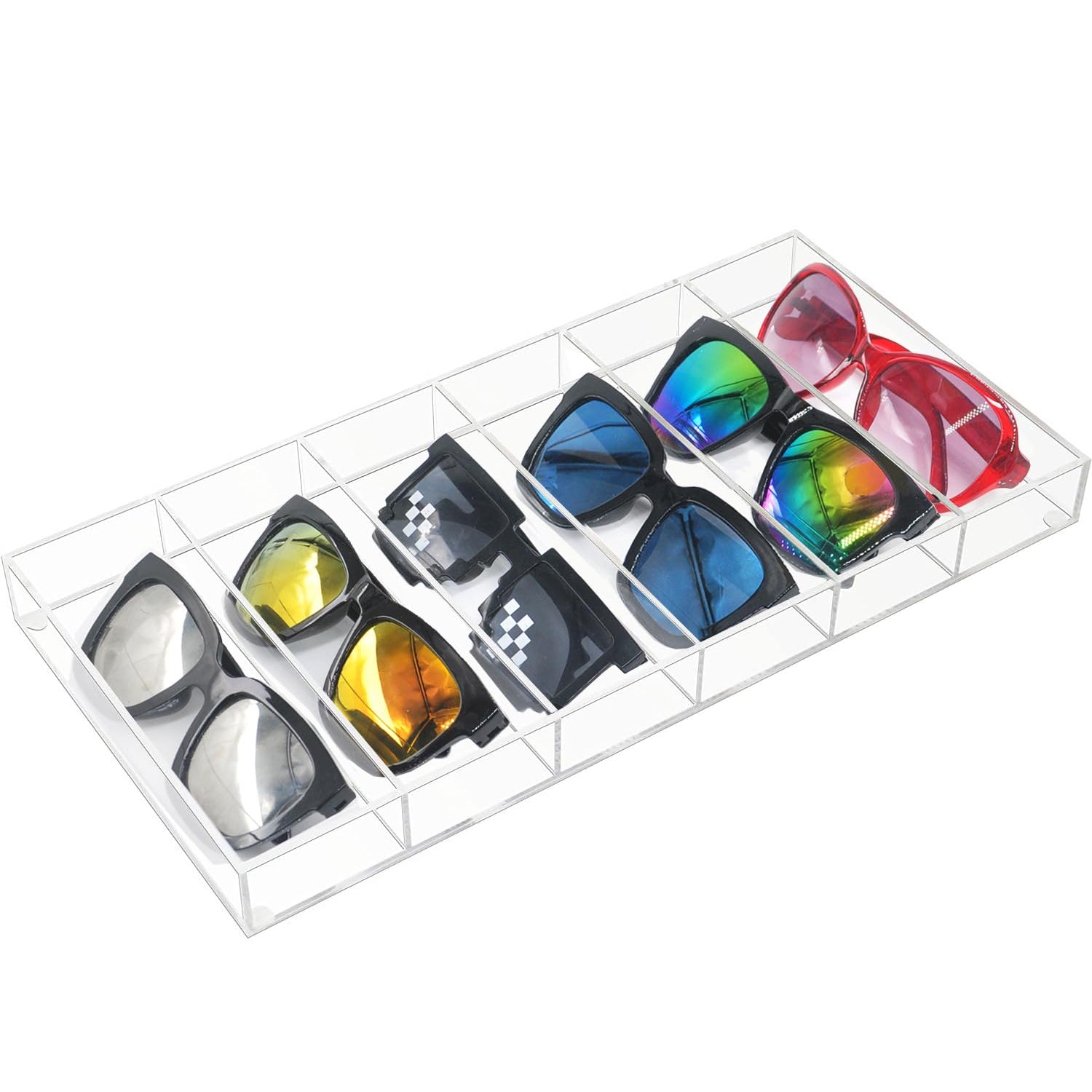 - Product Size: each Acrylic sunglasses tray measures 14.3"L x 7"W x 1.3"H, each compartment measures 7"L x 2.4''W x 1.3"H, provide plenty of space for a variety sunglasses