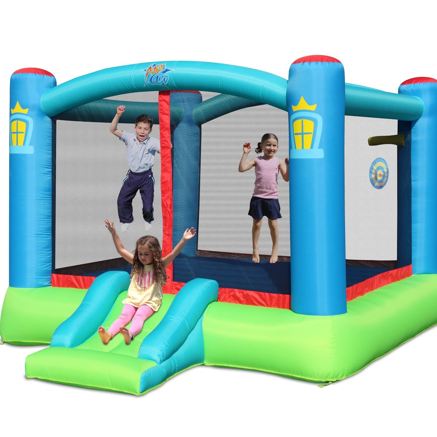 - Giant Holiday Gift: Bounce house with blower comes with wide slide, basketball hoop, flying dart. It adding so much fun beside bouncing. A great gift to your children for any holiday season and kids will definitely love it without any disappointment. Perfect gift for birthday, Thanksgiving, Christmas and New Year or whenever to keep the little ones busy.