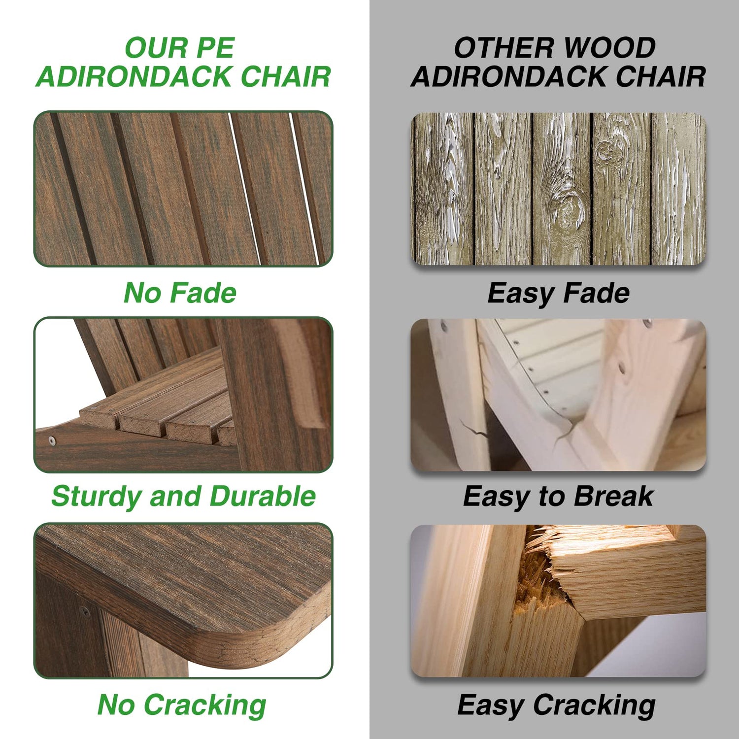- [Just Like Real Wood] The folding Adirondack chair is made of recycled materials HDPE instead of ever-decreasing wood. All surfaces have a wood grain with texturing that simulates real wood, it is difficult to recognize the difference between our products and solid wood products.