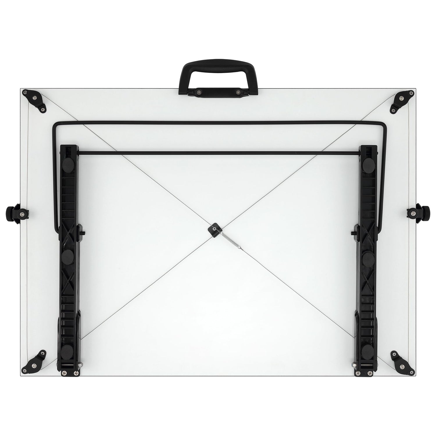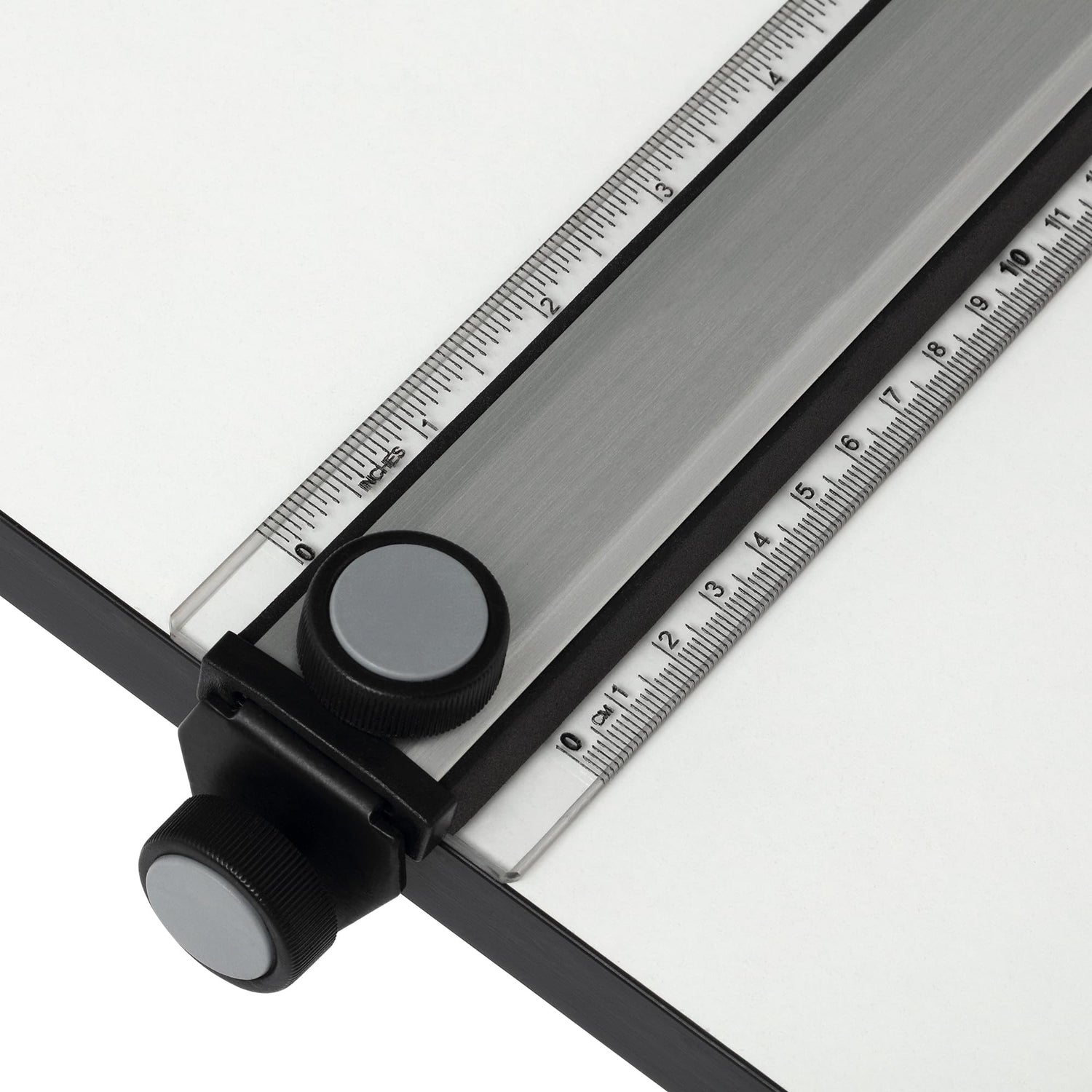 - Transparent Ruler - This compact portable work surface features a transparent ruler with inch markings and inking edge for drawing precise horizontal lines and taking measurements
