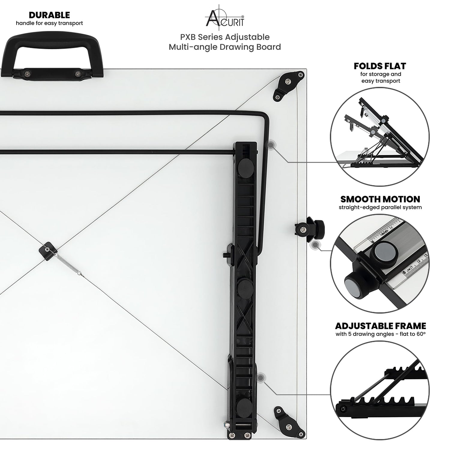 Acurit PXB 23” x 31” Drawing Board for Artists and Designers - Portable Workspace for Drawing, Sketching, Drafting, Painting - Multi-Angled Laminated Surface with Ruler and Parallel Motion Bar