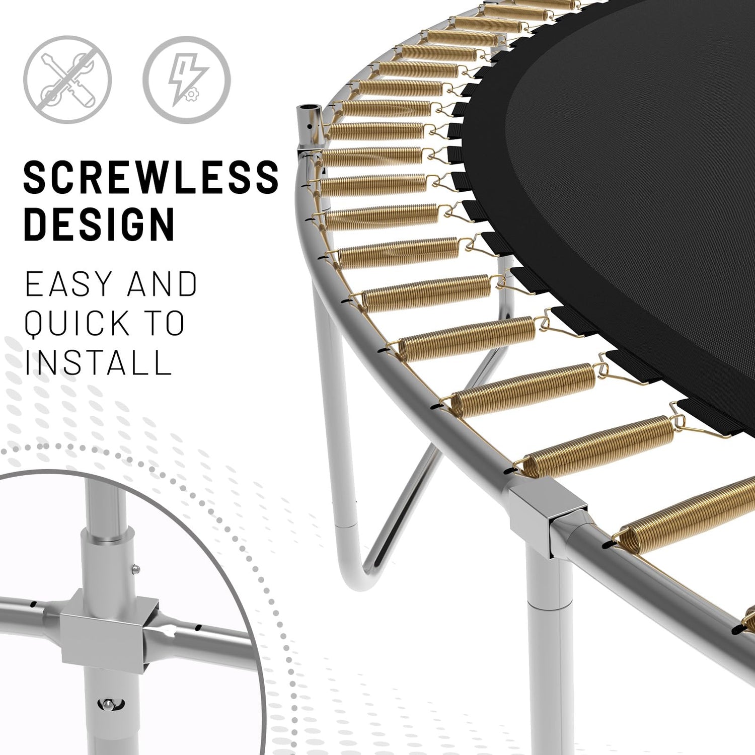 - Built to Last & Easy to Assemble - Experience durability and convenience with our outdoor trampoline! This 14-foot trampoline features a galvanized steel frame and silver-gray powder-coated T-connectors, offering exceptional corrosion resistance and weather durability. No screws needed, making installation a breeze compared to other recreational trampolines. Transform your backyard with this big trampoline for backyard, providing a hassle-free and sturdy solution for kids trampoline outdoor fun!
