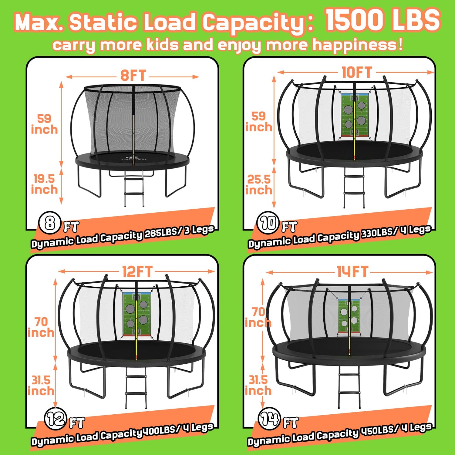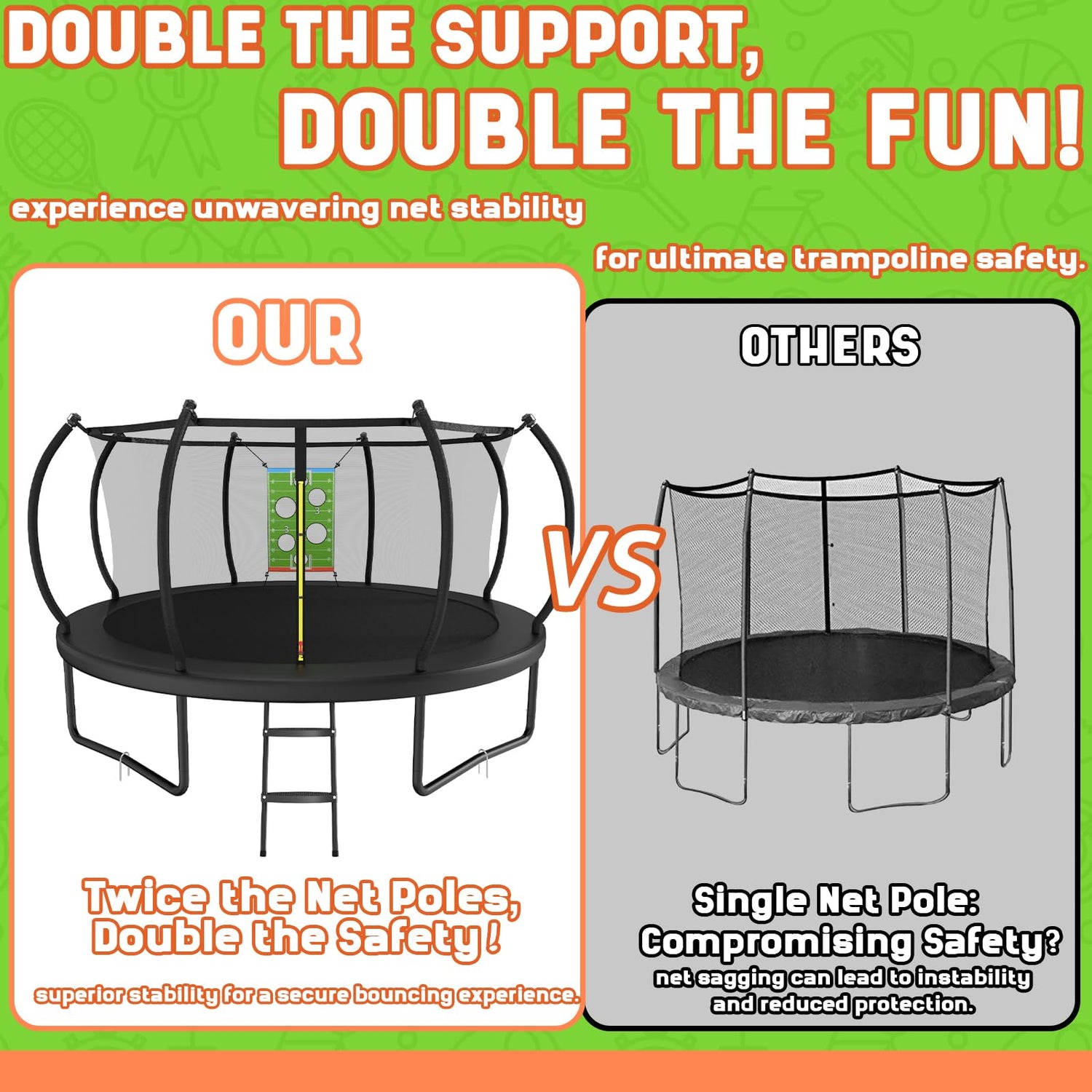 - Maximum Protection for Outdoor Fun - Our trampolines for kids outdoor come with a high-density flexible safety net for UV protection and injury prevention. The trampoline with net features sturdy, durable curved poles, offering a larger safety space. This trampoline with enclosure ensures your child's safety, making it the perfect choice for trampoline outdoor fun.