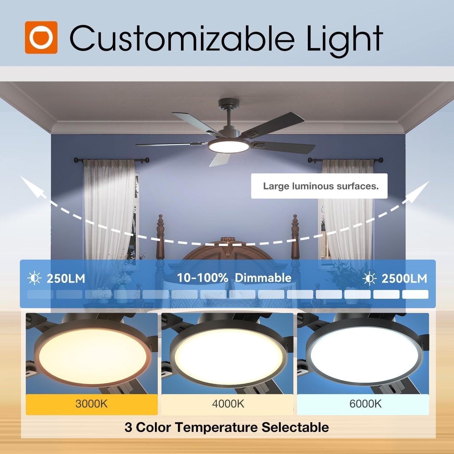 - Customizable Light: Depending on your need for the space, the light output you need can vary. If you’re having a cozy night in, you may need less light, while activities like family game night or homework time may need more. Our ceiling fans with lights are dimmable (10%-100%) for allowing you to find the ideal light for every occasion. At the same time, you can also select from 3 color temperature: 3000K-warm white, 4000K-nature white, 6000K- cold white.