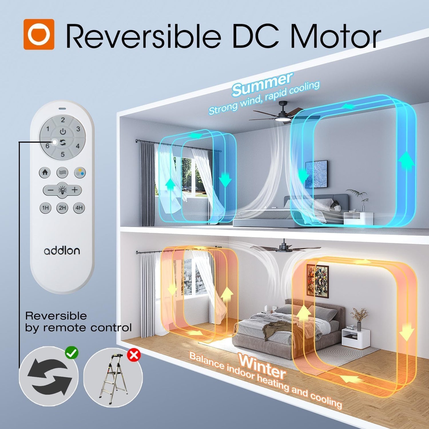 - Ceiling Fan with Light: Bring more than just wind and light, but comfort! addlon modern ceiling fan, with double-sided fan blade design, it can be the perfect decoration in your home while delivering enough airflow and light. Our 52 inch DC motor ceiling fan with light remote control has A energy efficiency rating, which can avoid 80% of electricity loss compared with traditional fans.