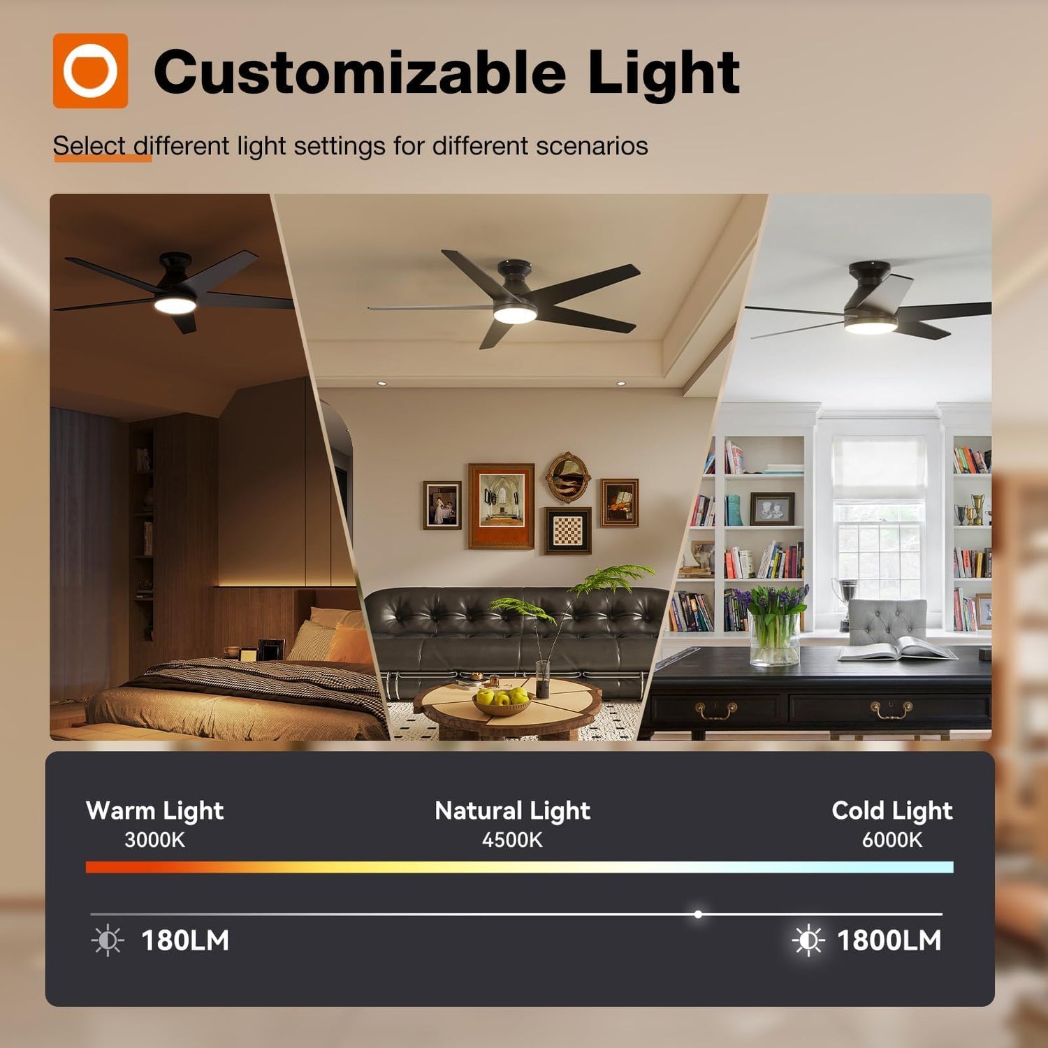- Customizable Light: Depending on your need for the space, the light output you need can vary. If you’re having a cozy night in, you may need less light, while activities like family game night or homework time may need more. Our smart ceiling fans with lights are dimmable (10%-100%) for allowing you to find the ideal light for every occasion. At the same time, you can also select from 3 color temperature: 3000K-warm white, 4000K-nature white, 6000K- cold white.