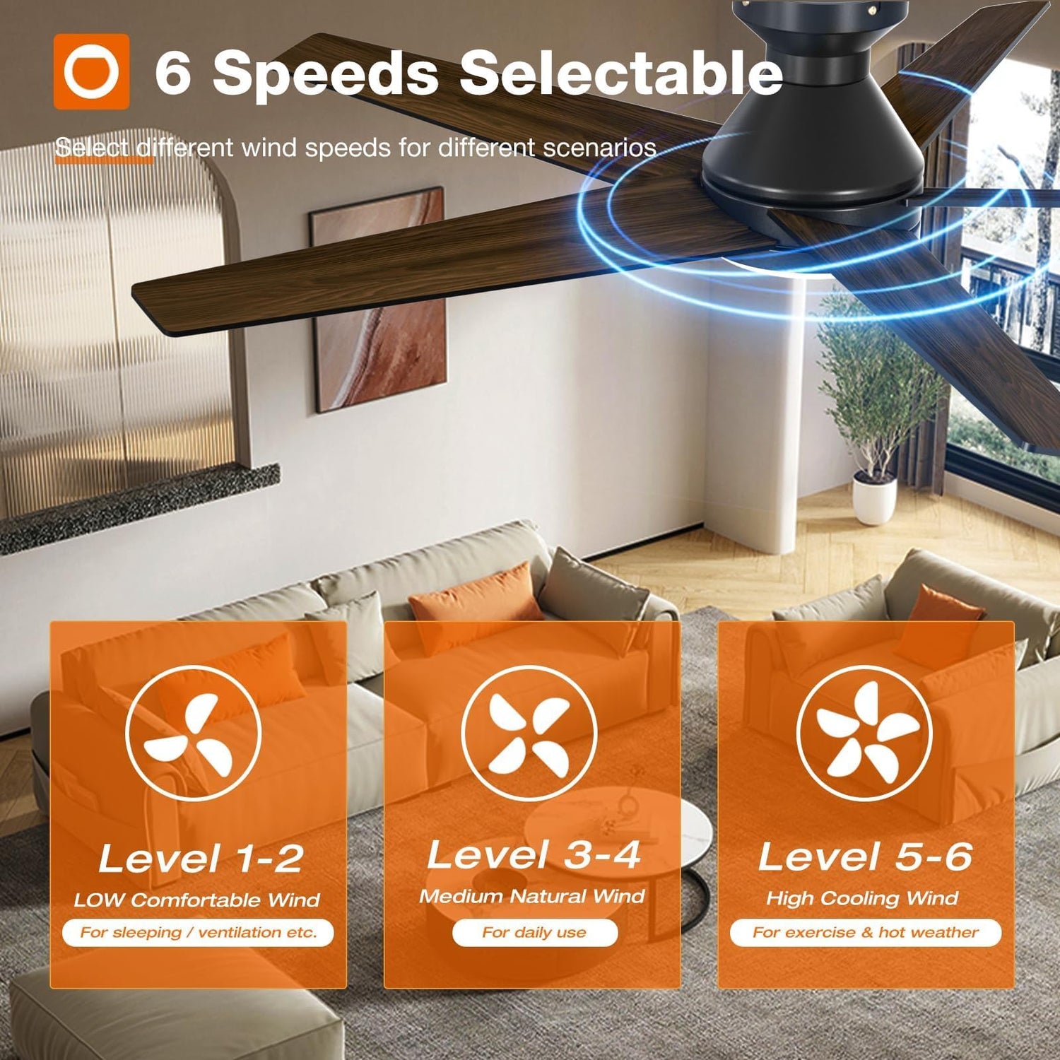 - Reversible DC Motor: The high-quality & high-speed motor brings a perfect wind experience. The wind speed can be adjusted in 6 gears, you can choose between comfortable wind, natural wind and strong wind. Reversible dual-direction fan improves air circulation to keep you warm in winter and cool in summer. Our fan blades are double sided in different colors, one side is black and the other side is dark wood grain. Choose the fan blade color that best fits your home decor!