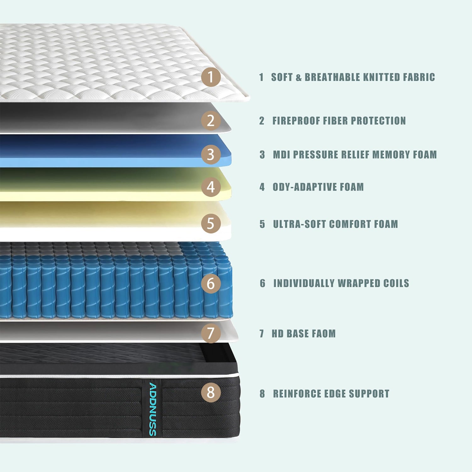 - BUY WITHOUT WORRIES: When opening the gel memory foam hybrid spring queen mattress, please be sure to keep a safe distance as the hybrid mattressmay expand quickly, and note that queen bed mattress takes 24-72 hours for the mattresses to be restored to its original state.At the same time, ADDNUSS Mattress comes with 10-year support. If you have any unsatisfactory issues, please contact us.
