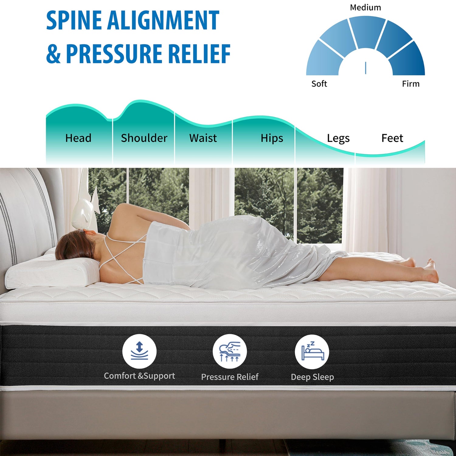 - COMFORTABLE SUPPORT AND A GOOD SLEEP: The 10 inch queen mattress utilize a unique combination of individually pocketed springs and memory foam, which ensures that your weight is evenly distributed from head to toe, which relieves your body from contacting the pressure points of the mattress, and helps to eliminate your body's fatigue and aches and pains and it greatly improve your sleeping quality.