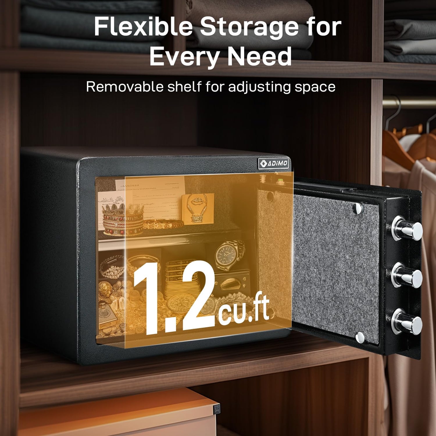 - Heavy-Duty Alloy Steel Construction for Ultimate Security: The ADIMO biometric fireproof safe for home is built with reinforced solid alloy steel and features three 1-inch thick bolts, providing superior strength and ensuring reliable protection for your valuables. Its anti-pry hidden hinges and thickened door make it nearly impossible to forcibly open from the outside.