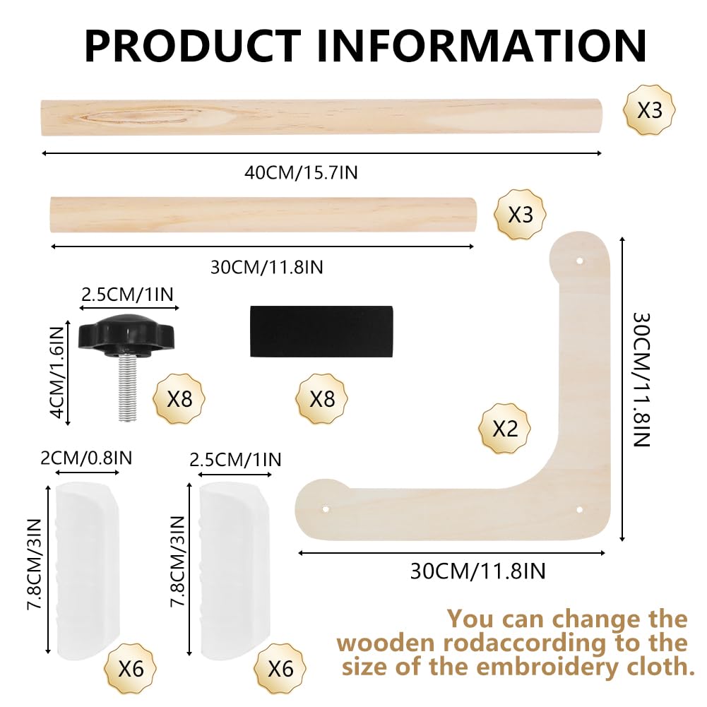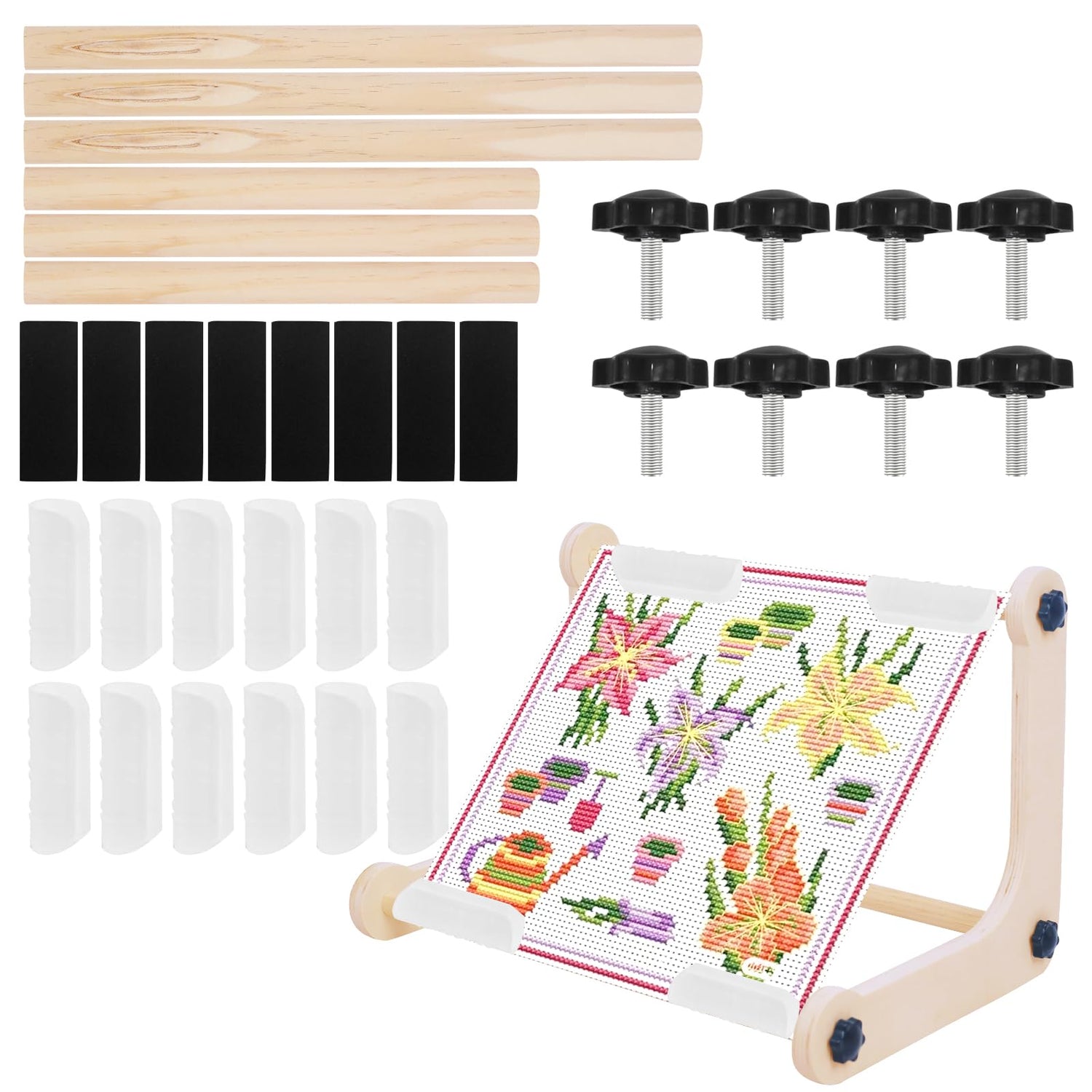 - Adjustable Design: This adjustable embroidery table stand comes with 2 wooden rods (11.8 inches and 15.75 inches), allowing you to choose the right size for your embroidery fabric. The cross stitch frame can be used on a tabletop or your lap, making it ideal for cross-stitch, needlepoint embroidery, and tapestry projects.