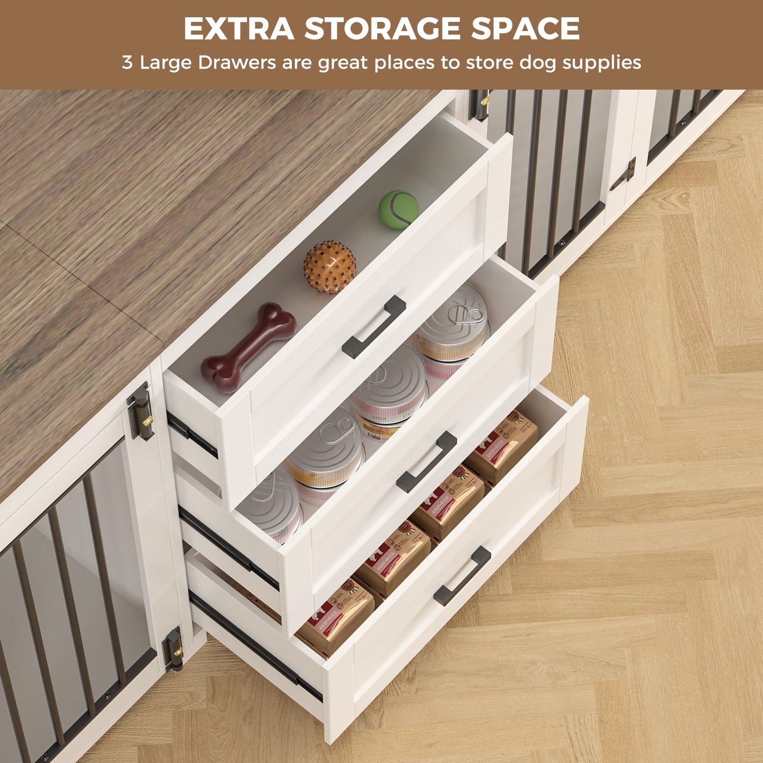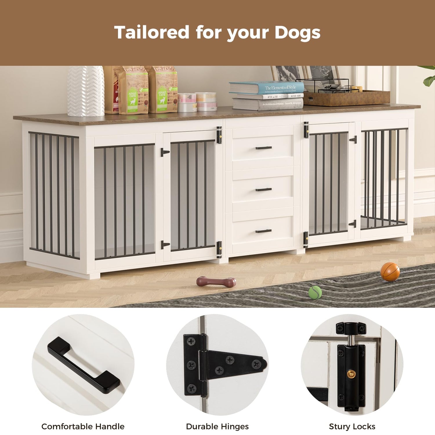 ADOFFUR 94.5" Large Dog Crate Furniture for 2 Dogs, Wooden Double Dog Kennel Furniture with 3 Drawers, Heavy Duty Indoor Furniture Style Dog Crate/TV Stand - White
