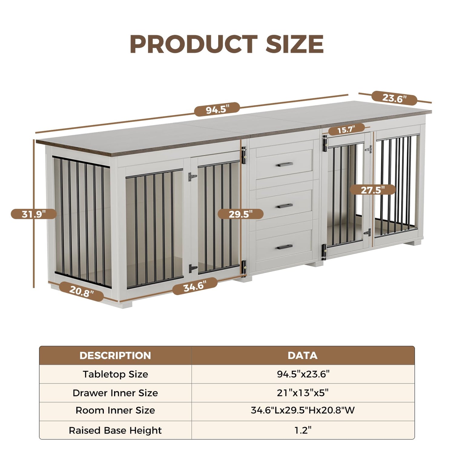 - 【Double Rooms Design】The overall dimension is 94.5" L x 23.6" W x 31.9" H, is suitable for 2 dogs to rest and prevent them from fighting each other. Please note that the internal room size is 34.6" L x 20.8" D x 29.5" H, be sure to measure your pet before purchasing to provide them comfort.