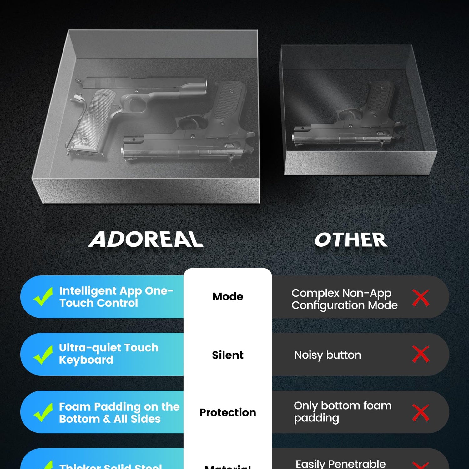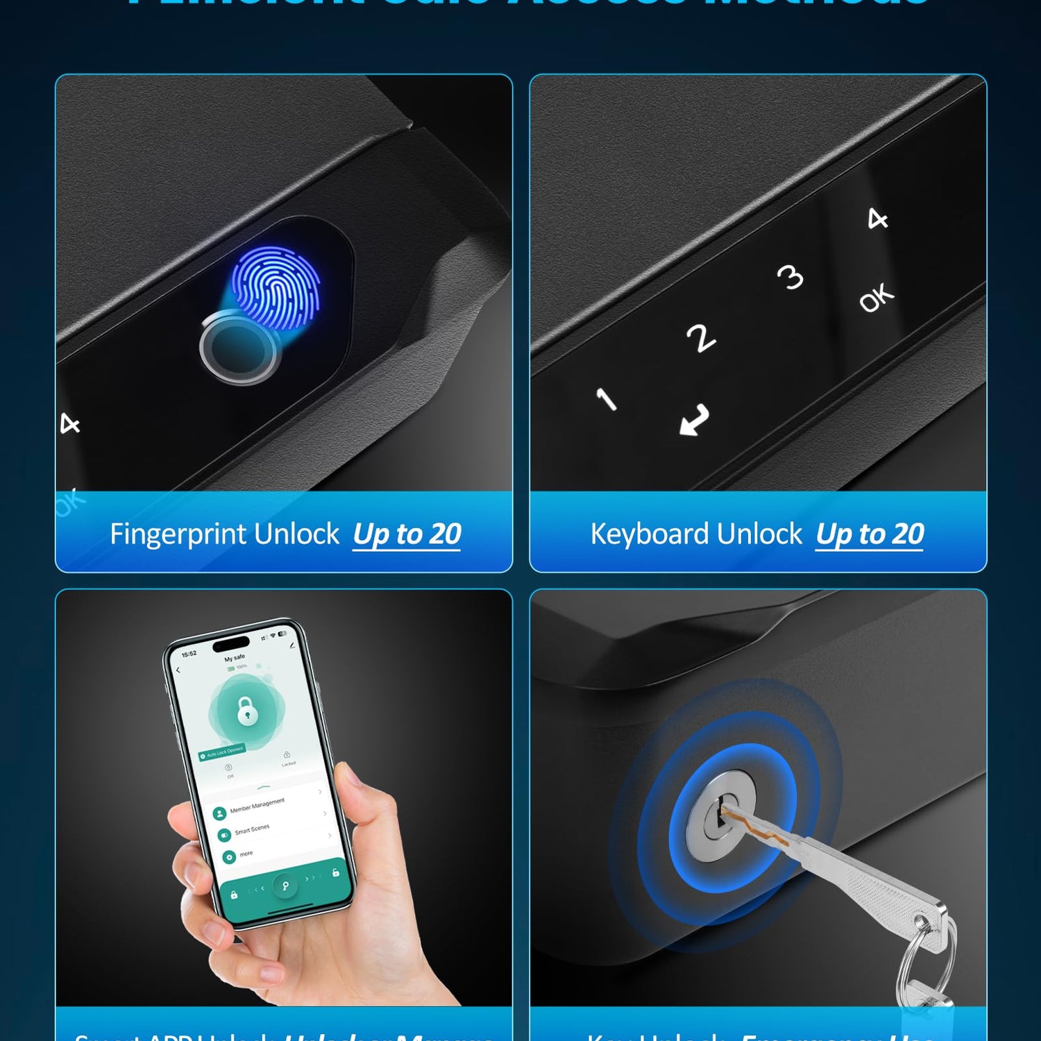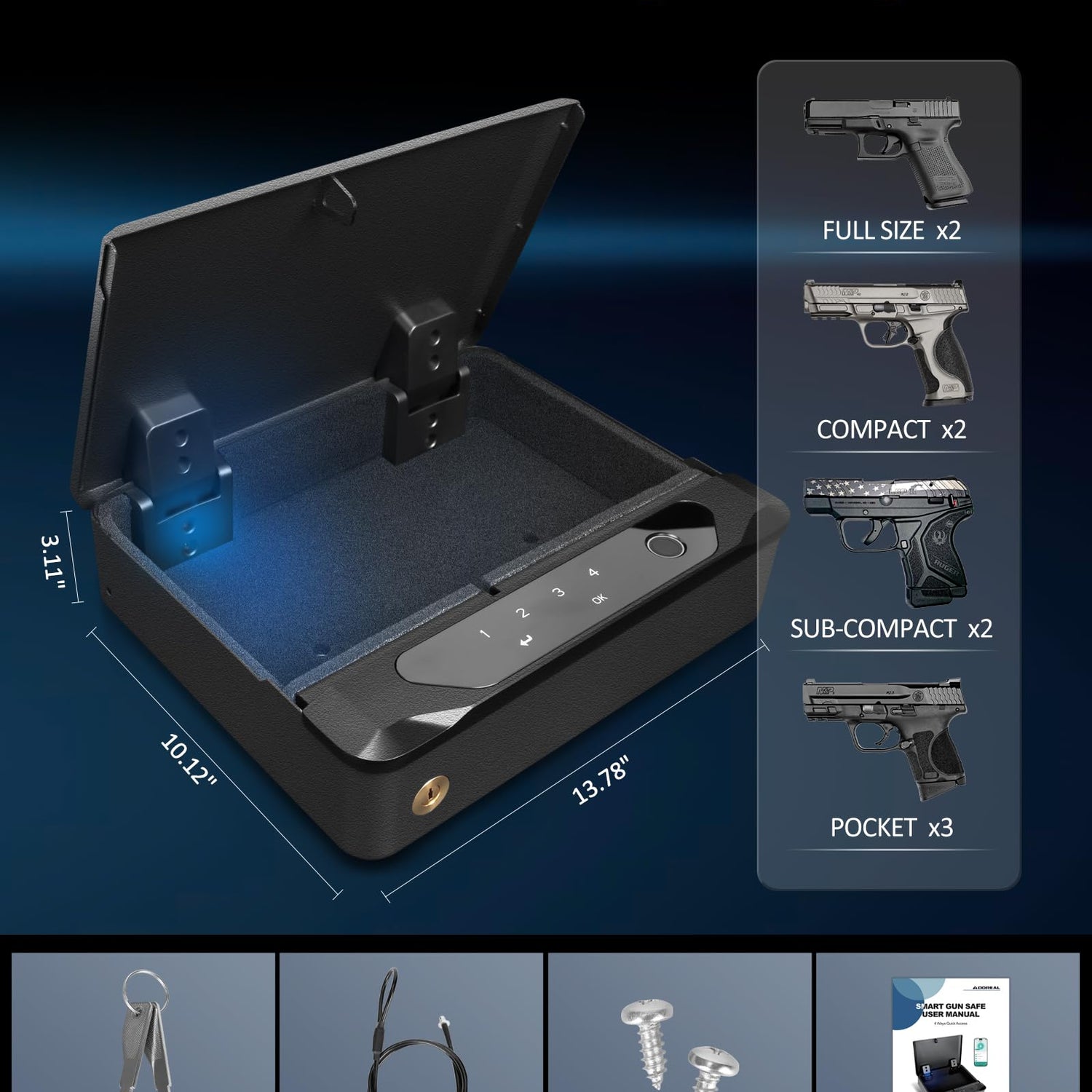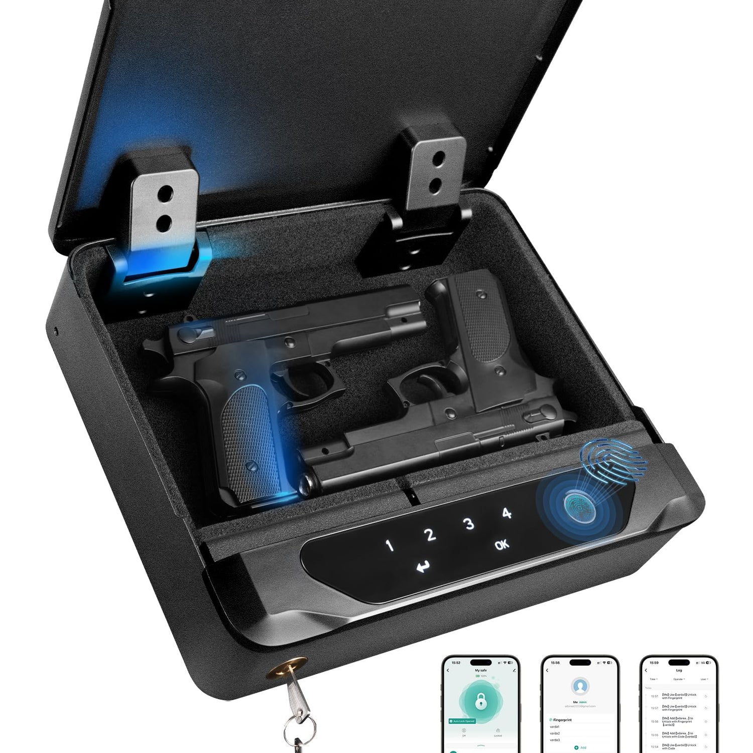 - 4-IN-1 UNLOCKING METHODS GUN SAFE - This safe securely stores two handguns, magazines, and other. Setup is simple, whether you use the biometric lock, keypad, smart app, or backup keys. You can trust that your firearm will stay securely concealed from children, while still allowing quick access when needed. (The biometric fingerprint scanner improves with repeated use—the more you use it, the faster and more accurate it becomes.)