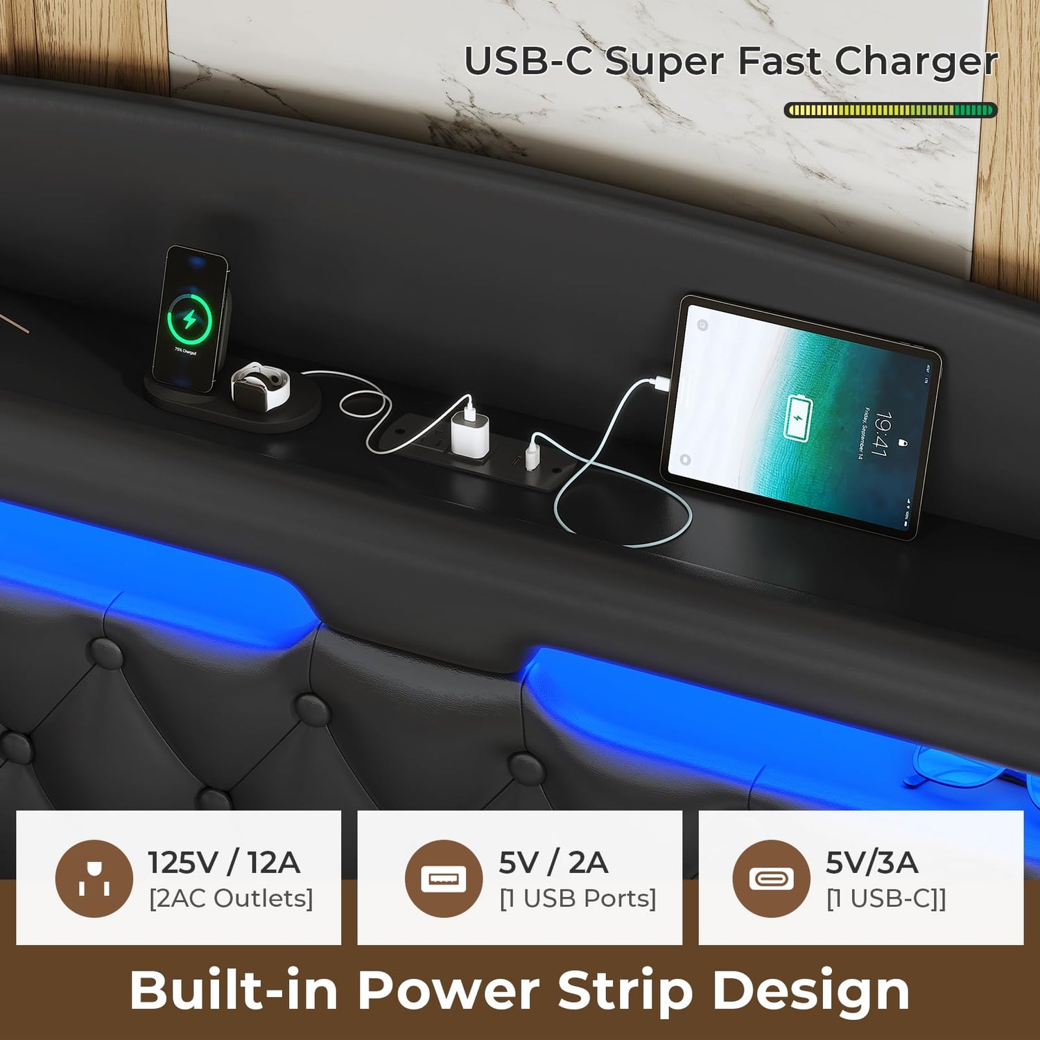 Convenience is key; that's why the bed frame comes equipped with a built-in charging station featuring one USB port, one outlet, and one Type-C port. Charge your devices effortlessly and stay connected without leaving the comfort of your bed.