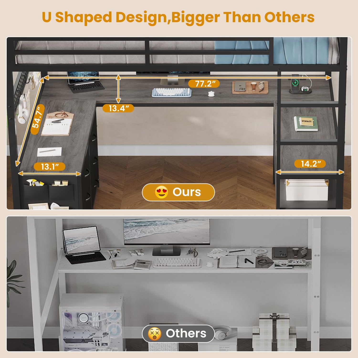 - 【Built-in Study & Workspace】 Unique 54.7"D x 77.2"W U-shaped desk with ergonomic design,The U-shaped desk is a study/work area that wraps around, giving ample space.With ample room for dual monitors, notebooks, and your go-to latte, this desk is a remote worker’s or student’s dream