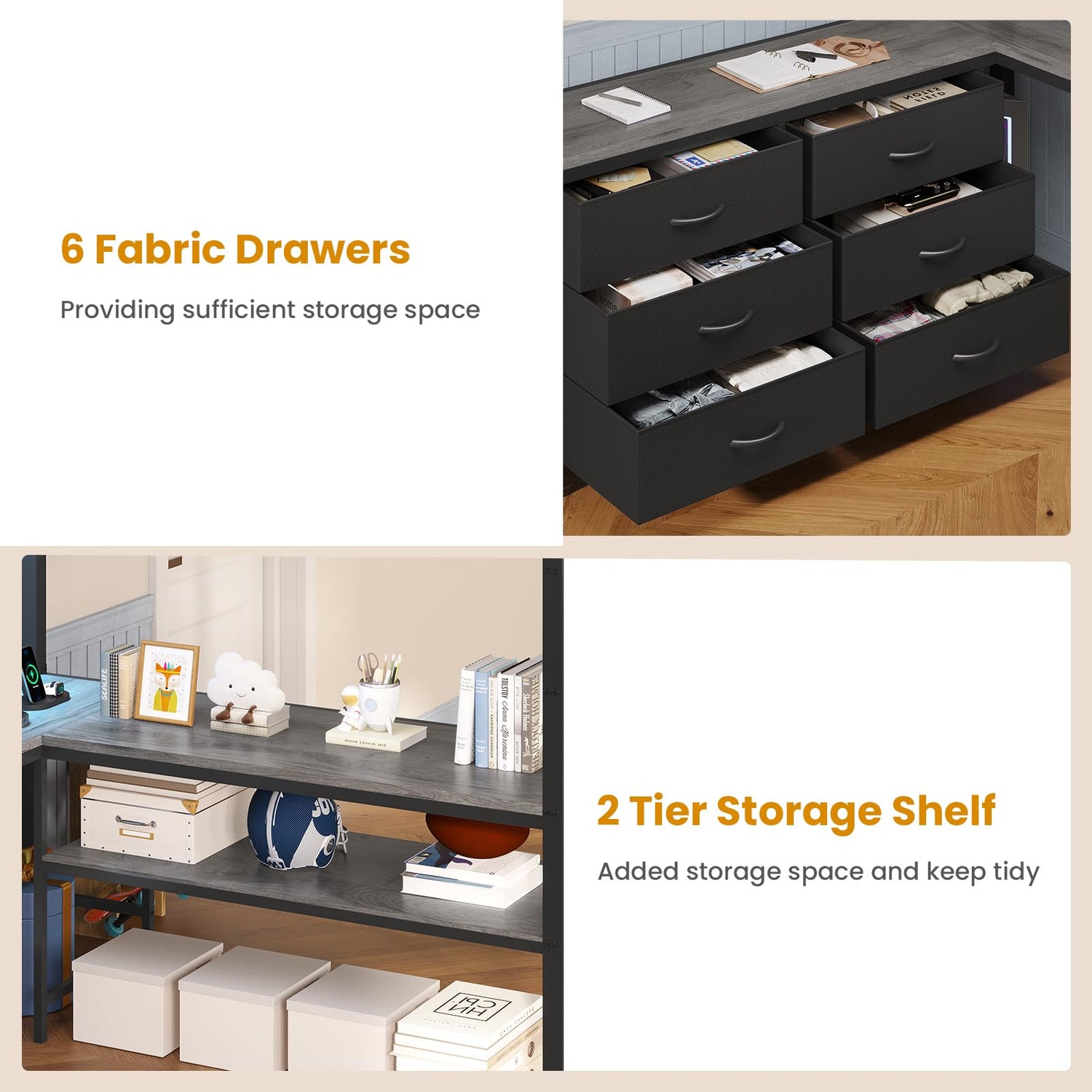 ADORNEVE Loft Bed Full Size with U-Shaped Desk, 6 Storage Drawers, Power Outlet, LED Metal Loft Bed with 2 Storage Shelves, Bed with Safety Guardrail & Ladders, No Box Spring Needed, Grey