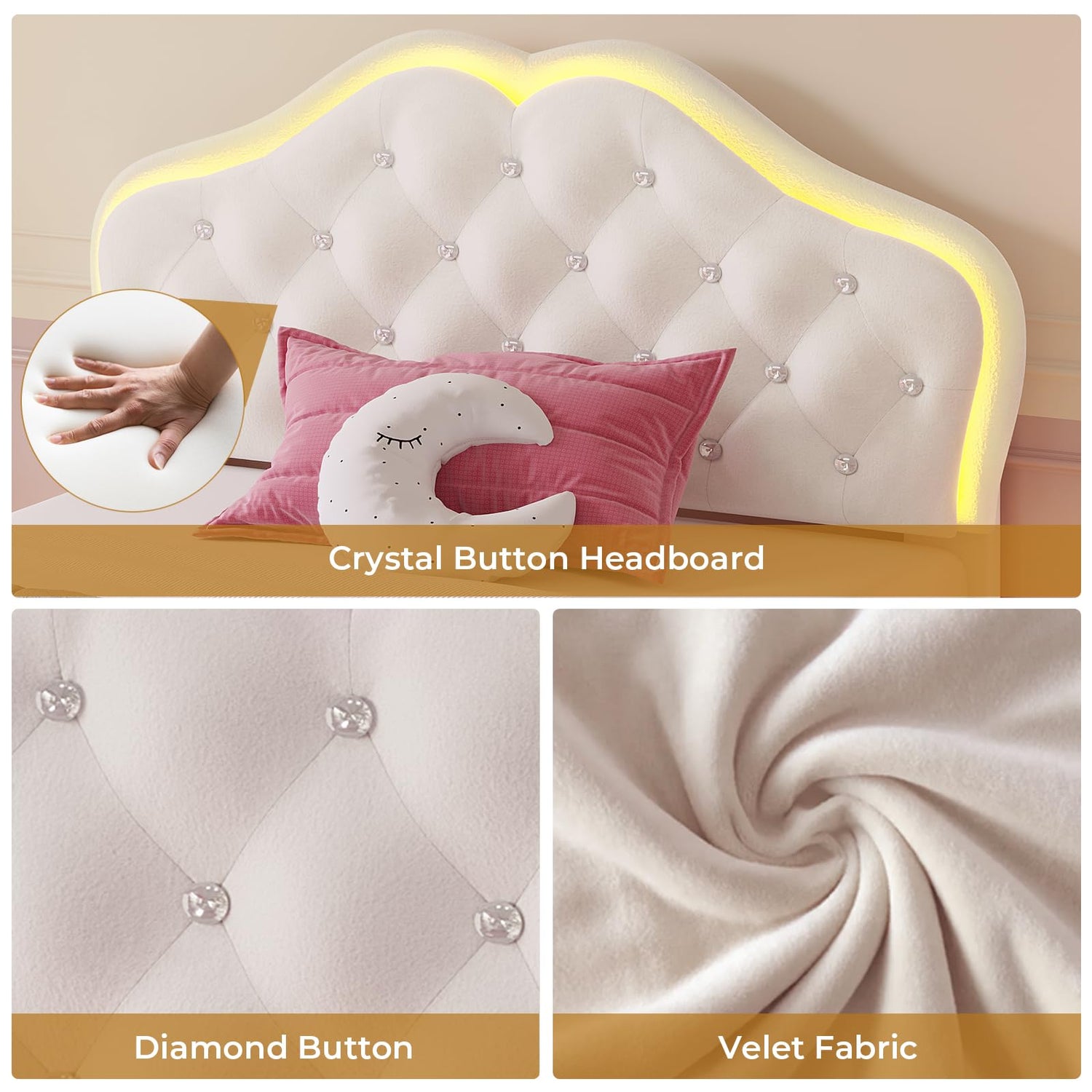ADORNEVE Twin Size LED Bed Frame with Storage Drawer, Girls Twin Bed Frame with Adjustable Crystal Button Headboard, Velvet Princess Platform Bed for Girls, Solid Wooden Slats,Creamy White