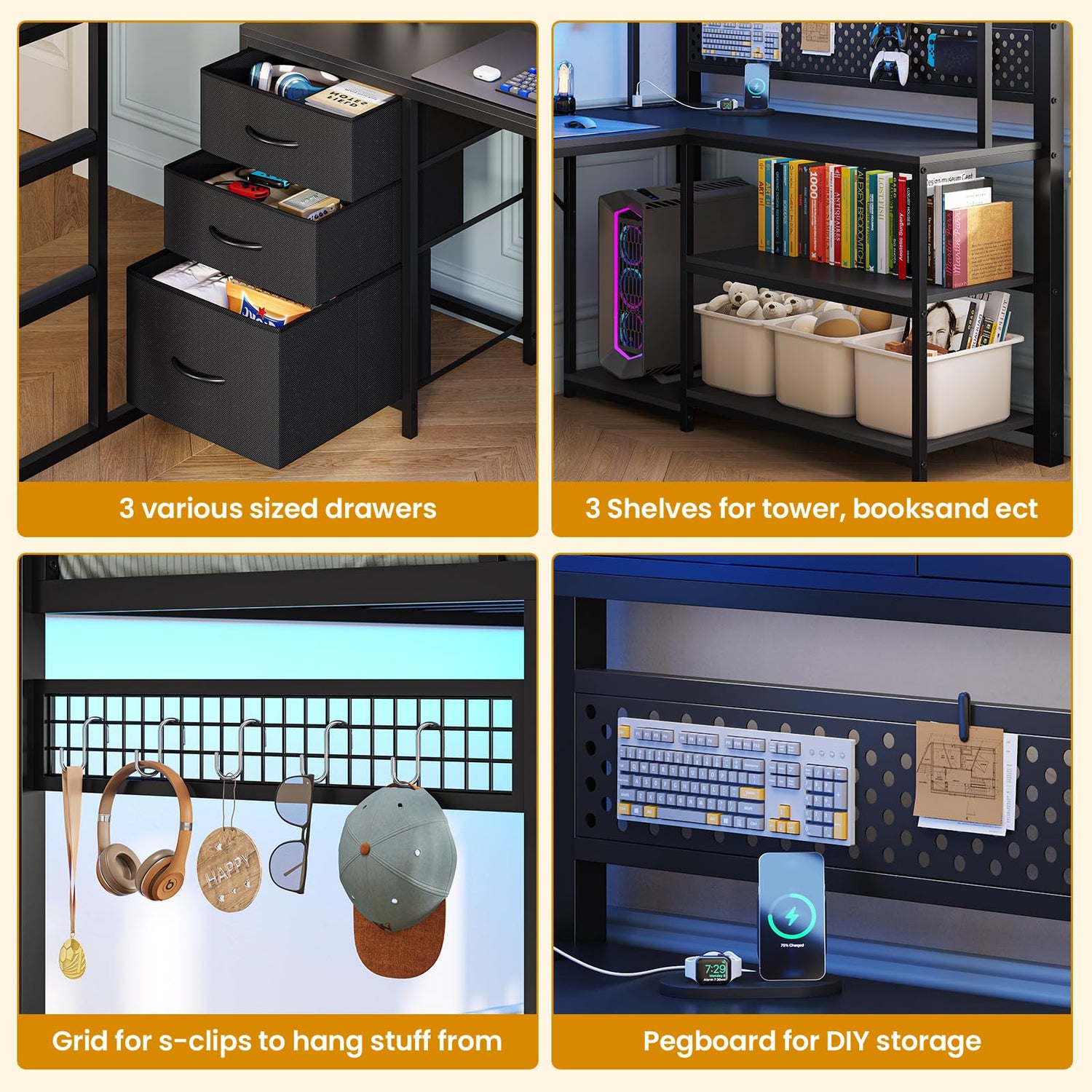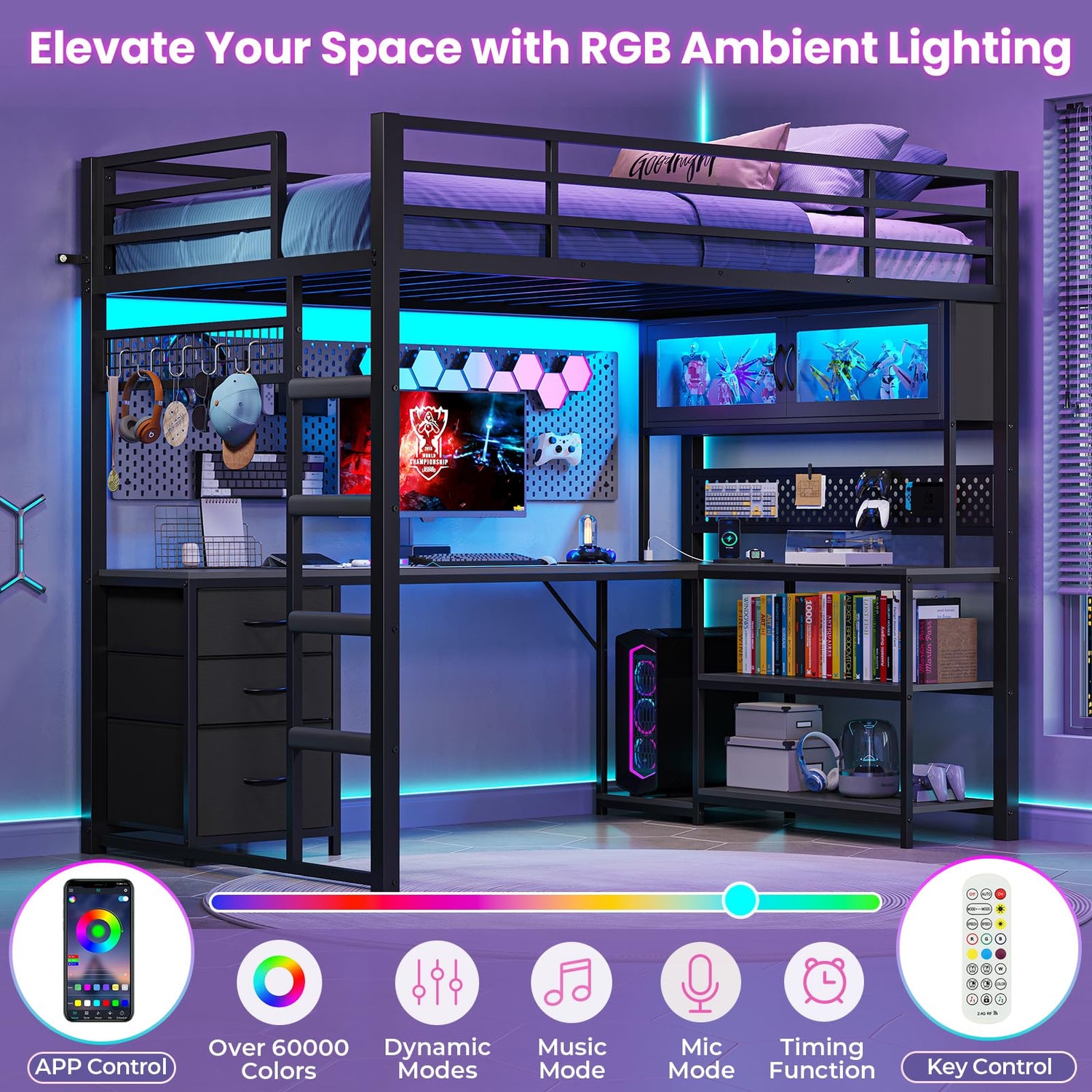 ADORNEVE Twin Size Loft Bed with L-Shaped Gaming Desk, Storage Drawers & Hutch, Expanded Safety Power Outlet, Metal Loft Bed Frame with RGB Lights, Space Saving for Teens, Black